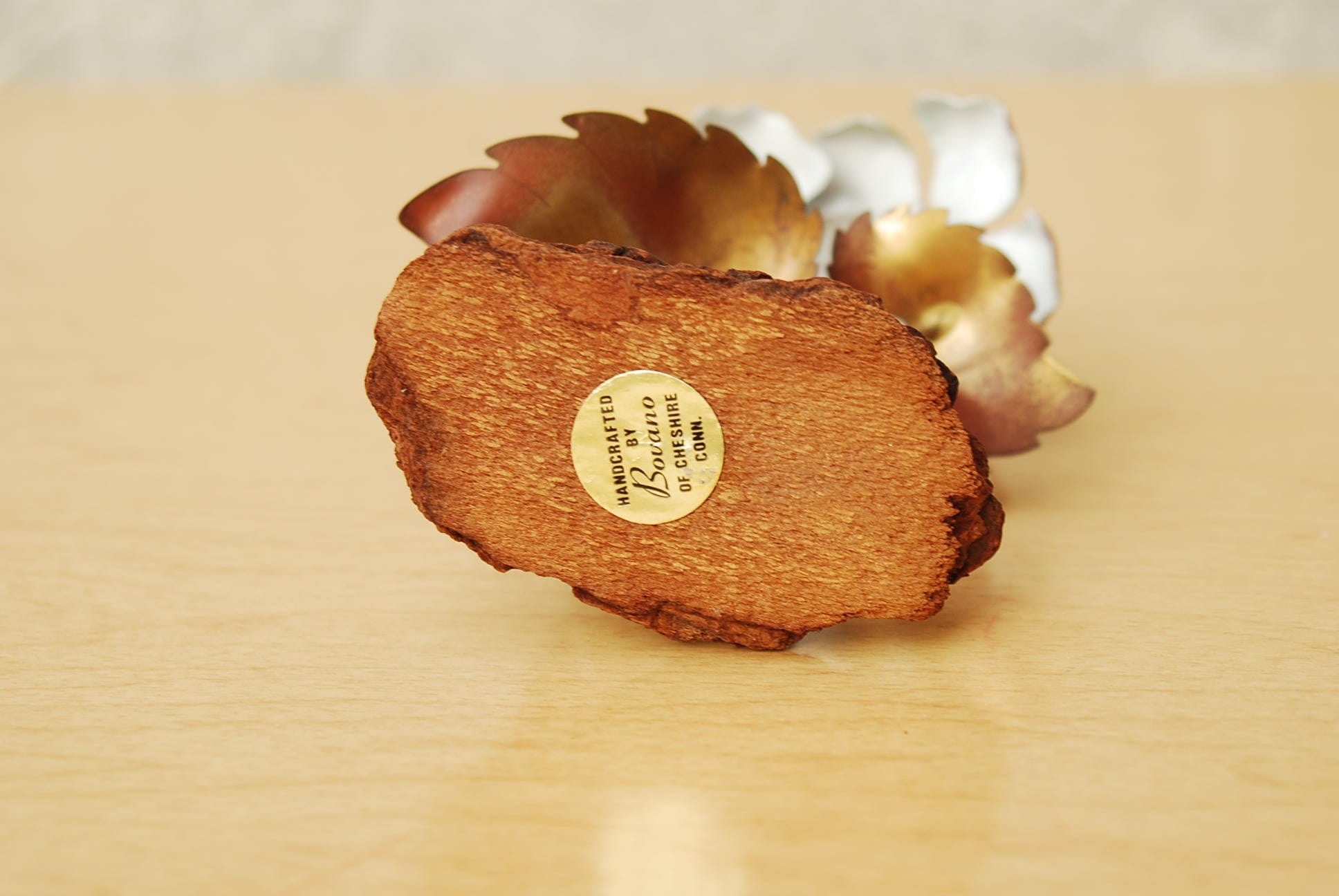 Bovano, founded in 1952, is known for their intricate enameled copper sculptures, which until this year were still made by artisans in Connecticut. This pair of miniature vintage flowers in red and blue is a prime example of their work. The flowers are copper throughout, and vitreous enamel (pulverized glass) bringing the petals to life. They are perched on real wood bark bases. They remain in very good original condition and have lost none of their charm.