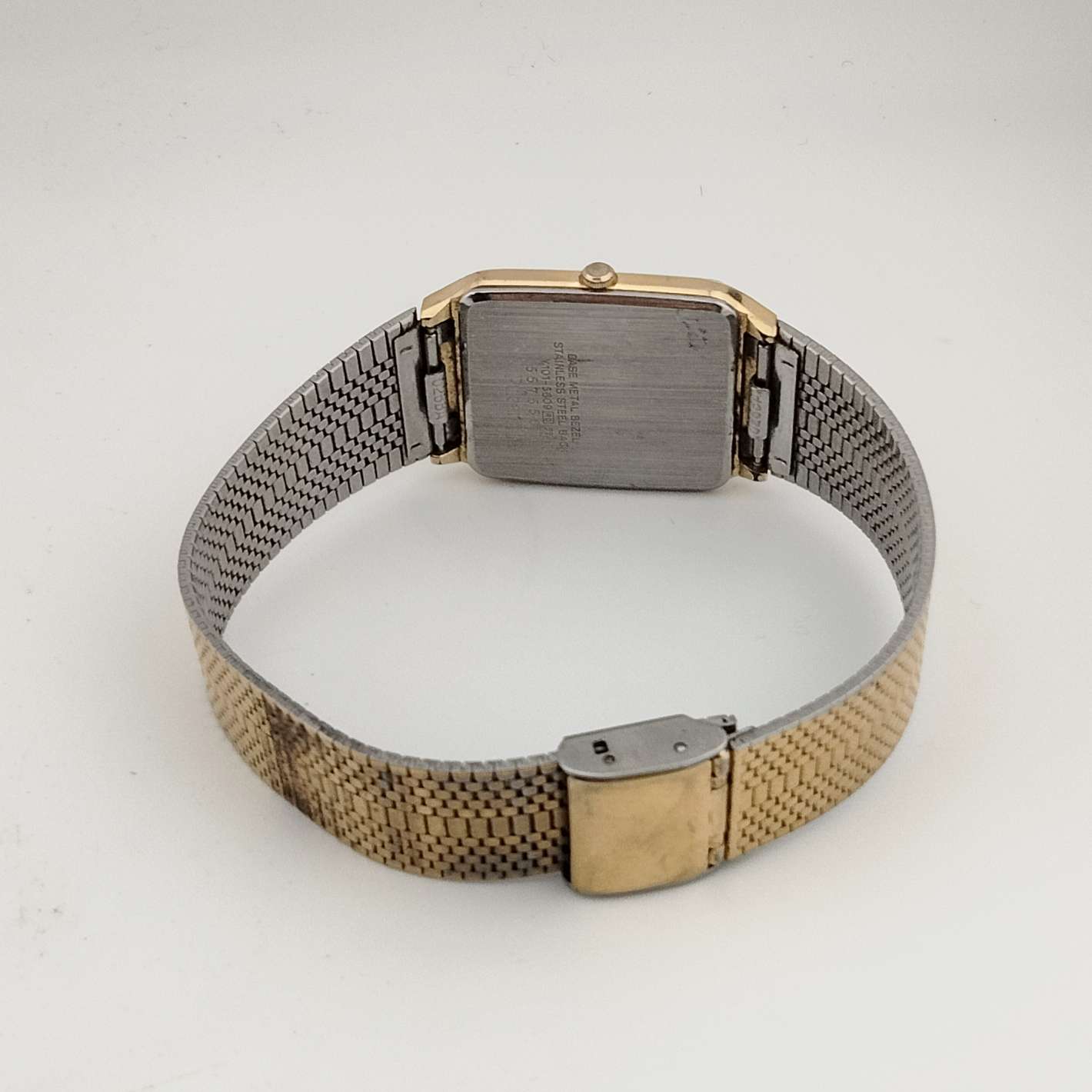 - Silver tone rectangular dial, raised gold tone dash hour markers black hands