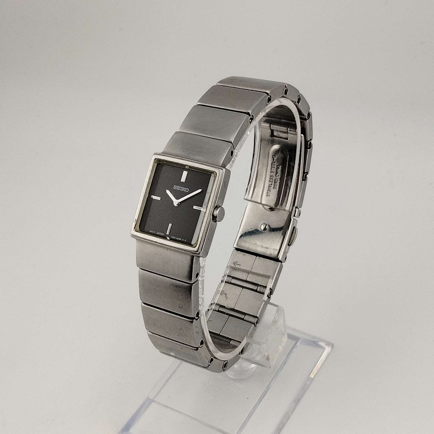 - Black, square dial with raised silver tone dash hour markers