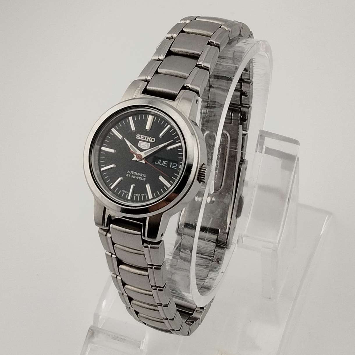 - Black dial with raised silver tone hour markers and hands
