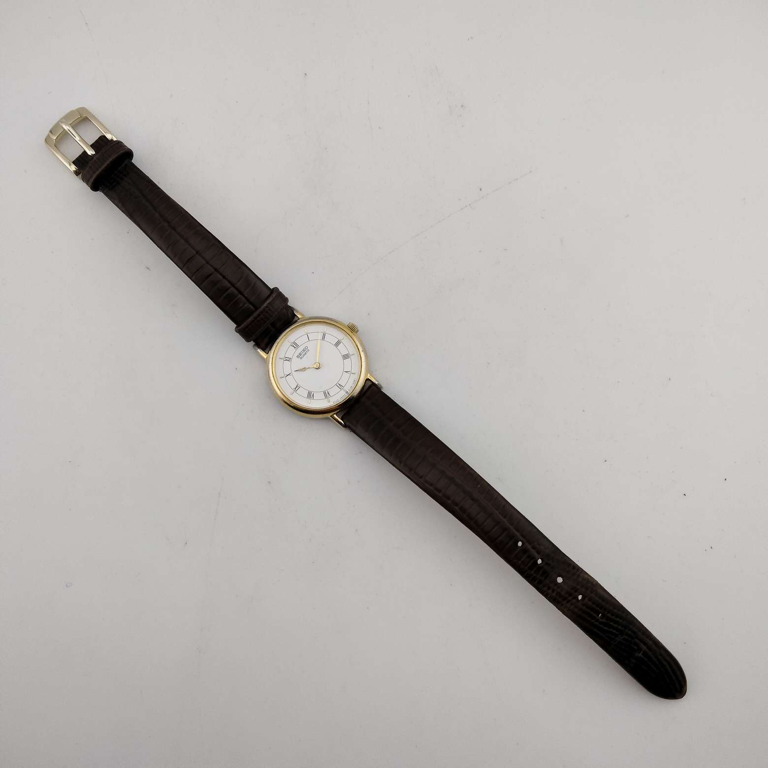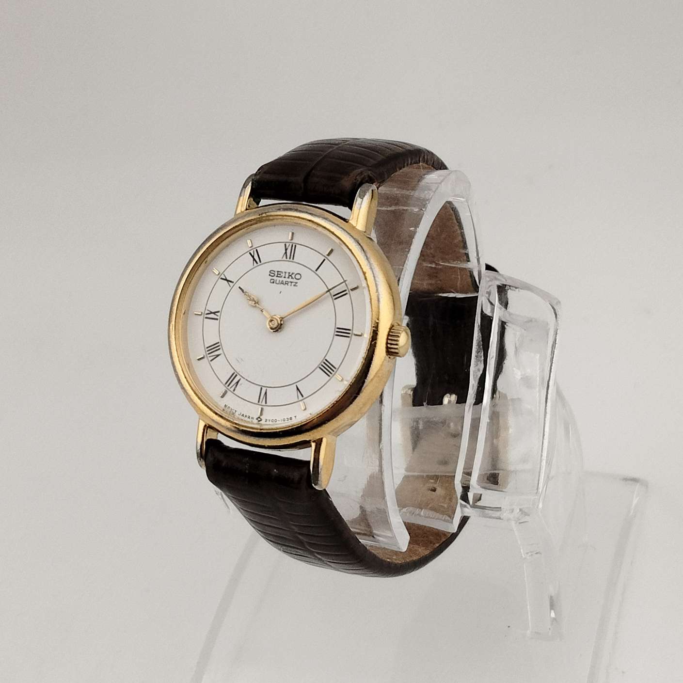 - Black roman numeral and gold tone dash hour markers, gold tone hands