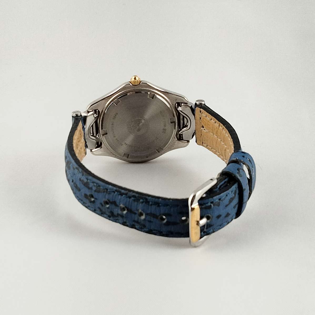 - Blue and black patterned leather strap, adjustable up to 7" long
