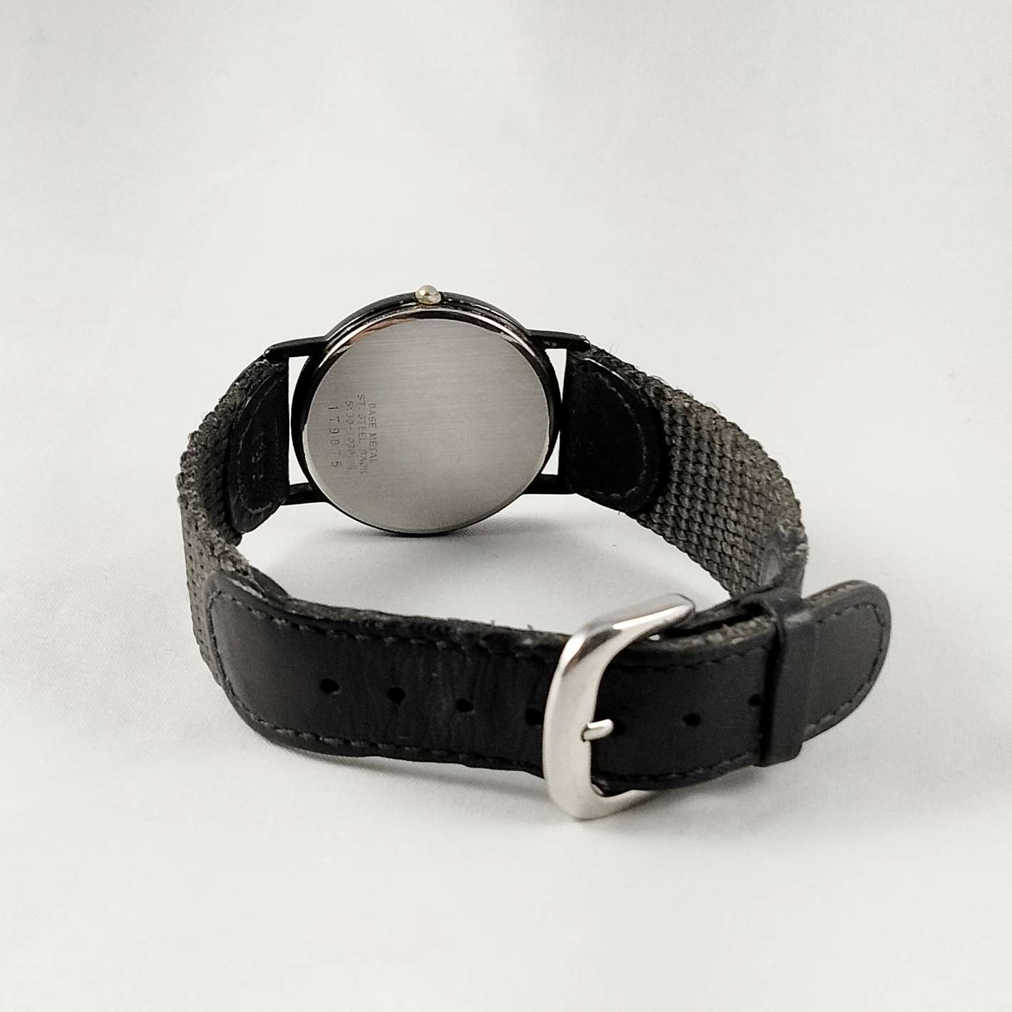 - Black leather and fabric strap, adjustable up to 6.75" long