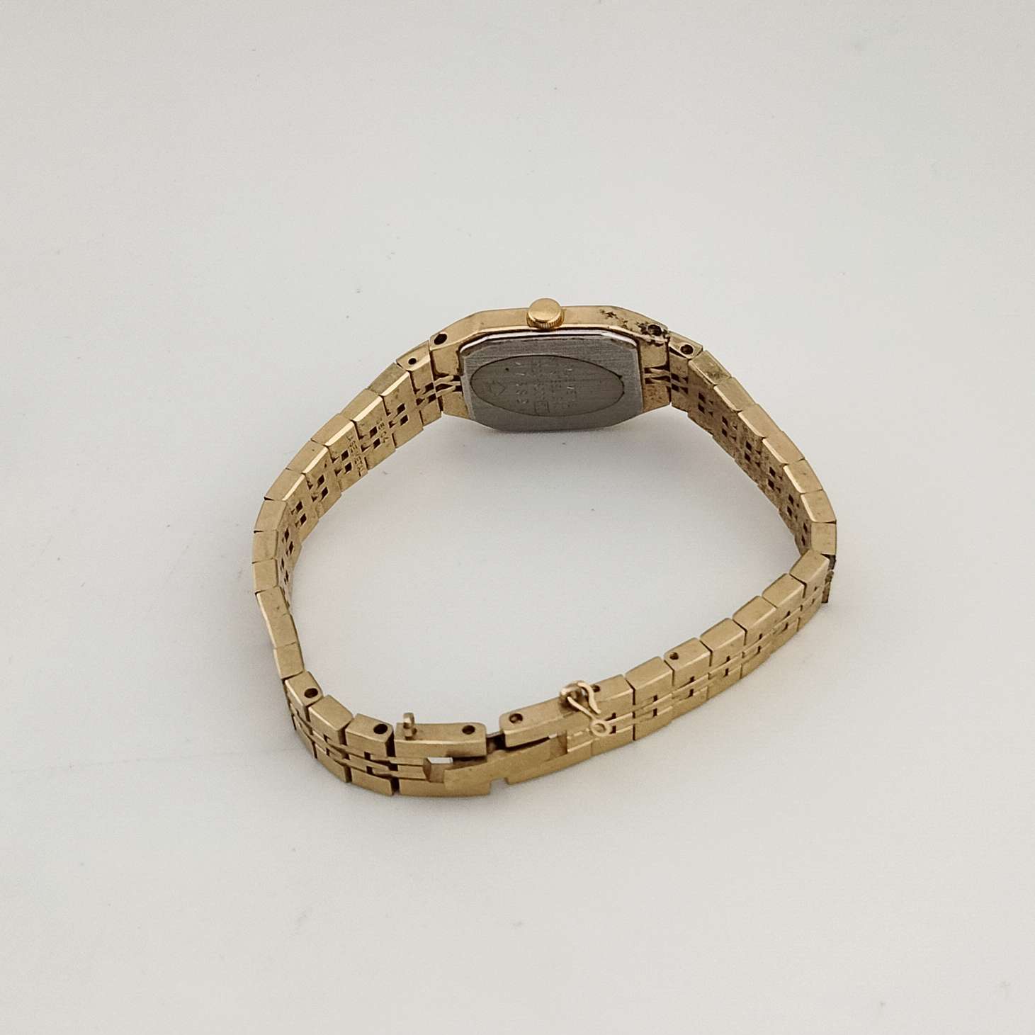 - Rectangular gold tone dial, black dash hour markers and hands