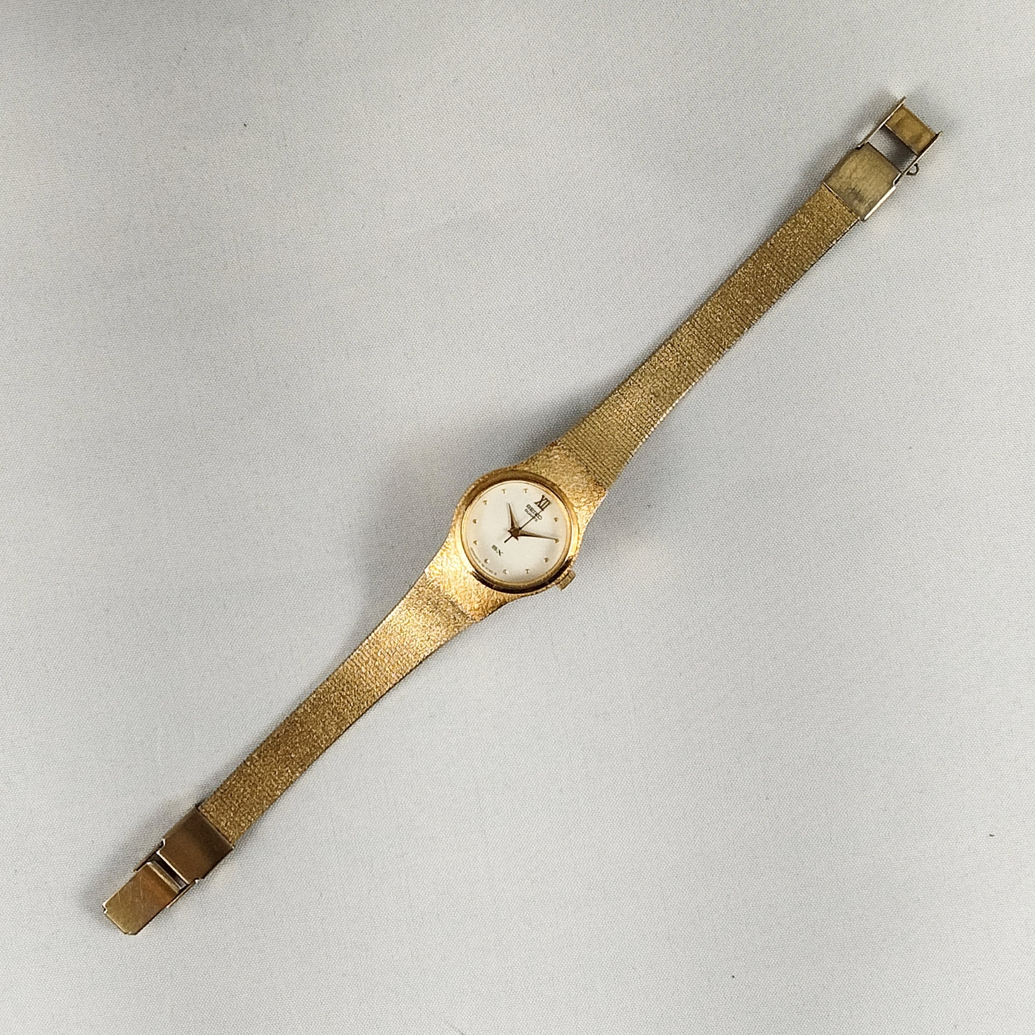 - Gold tone watch with white dial