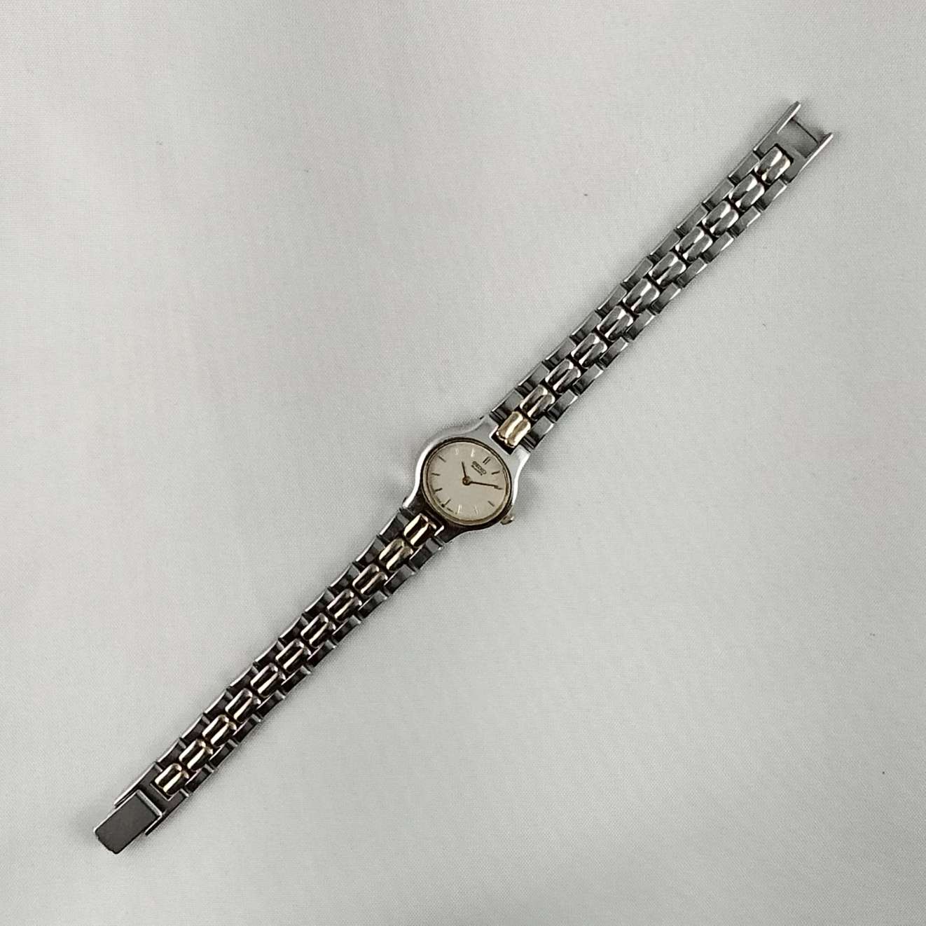 - White oval dial with slightly raised gold tone hour markers