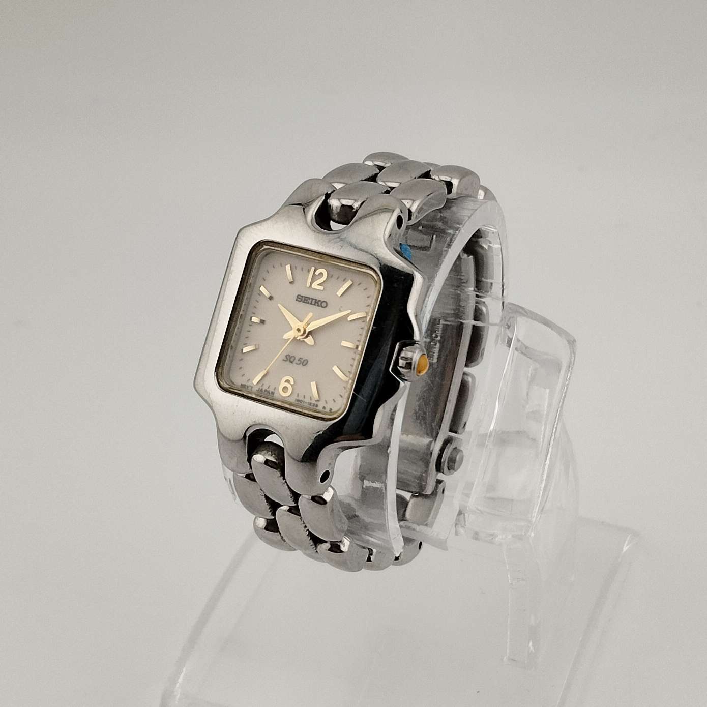 - Cream square dial with raised gold tone dash hour markers, and hands