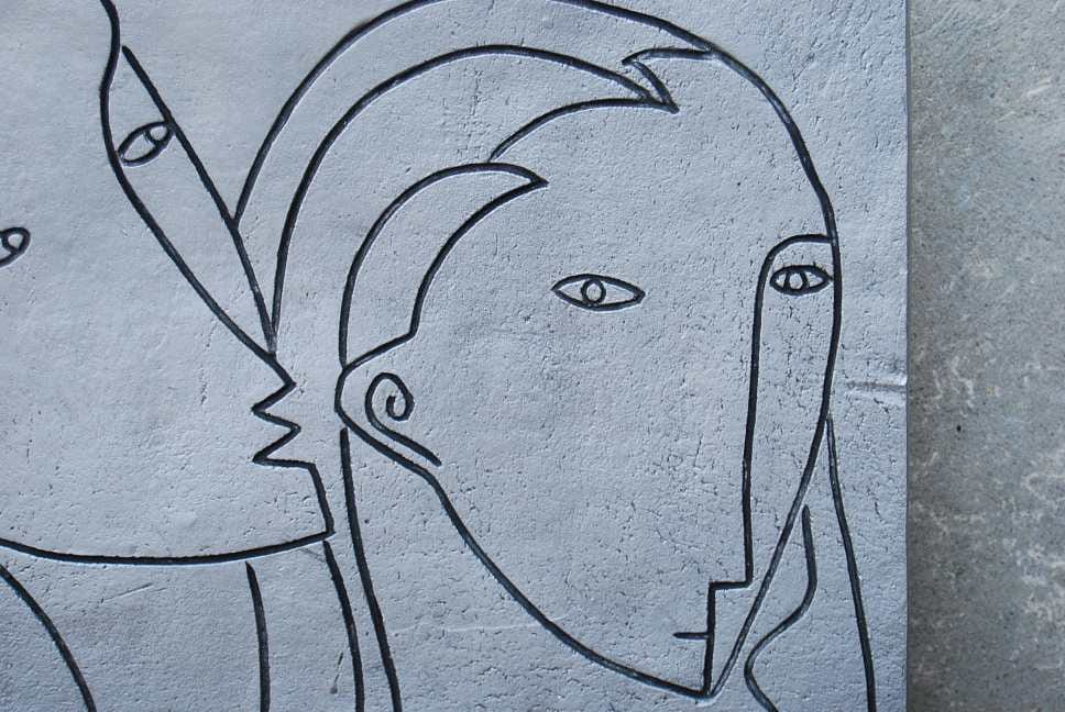 This unique piece of decorative art is quite substantial and very modern. The heavy ceramic top appears to float, improbably, on its metal base (from which it comes off easily, for storage or shipping). The textured grey, almost metallic background sets off the expressive line drawings of a man and a woman, who seem to know they can be seen yet are also enjoying a private intimate moment between themselves. What an artist can convey in several simple lines is impressive. Though not a mid-century piece, it is about 15-20 years old, and is in very good condition. We have no information about the artist or maker but we know it is a quality piece made with durable materials.