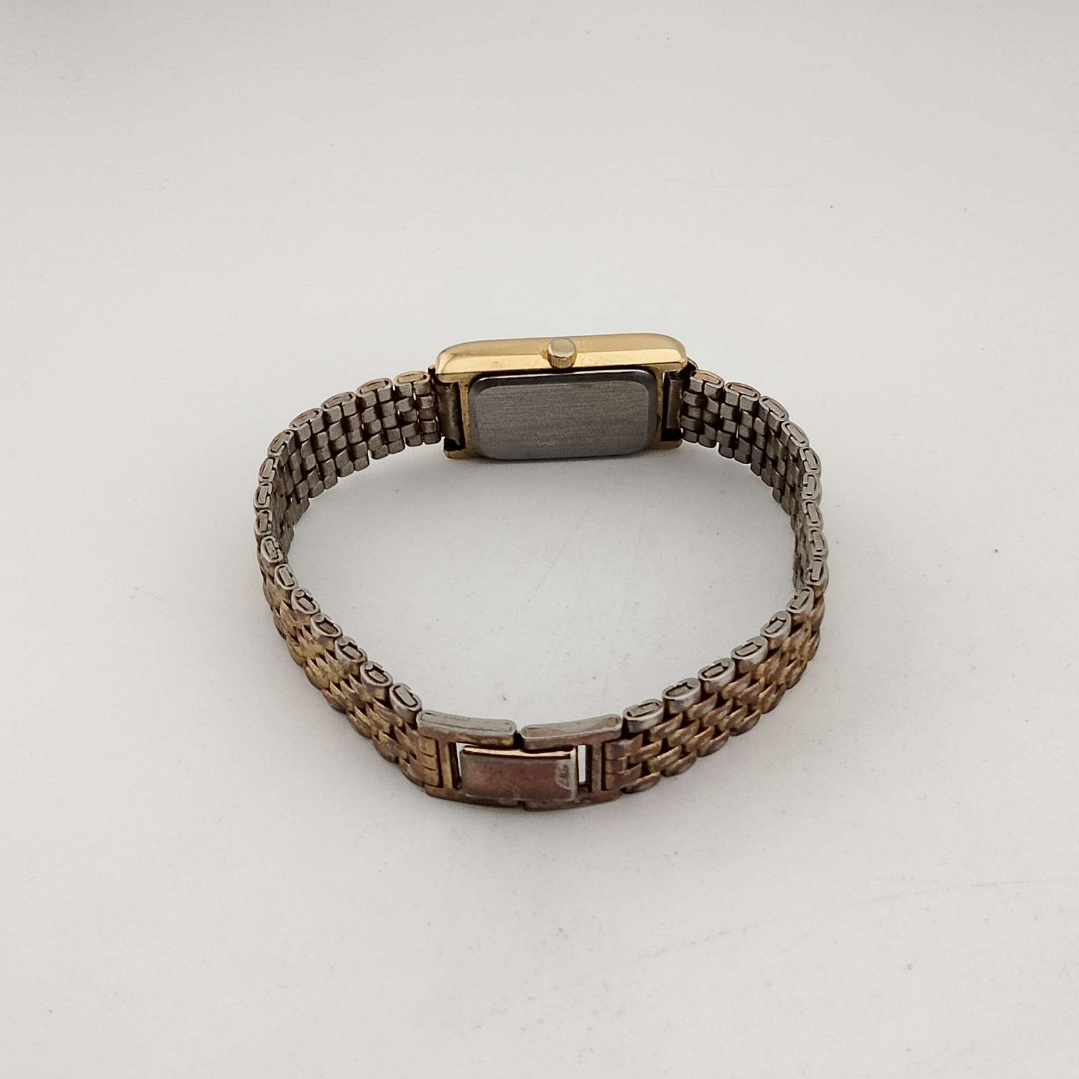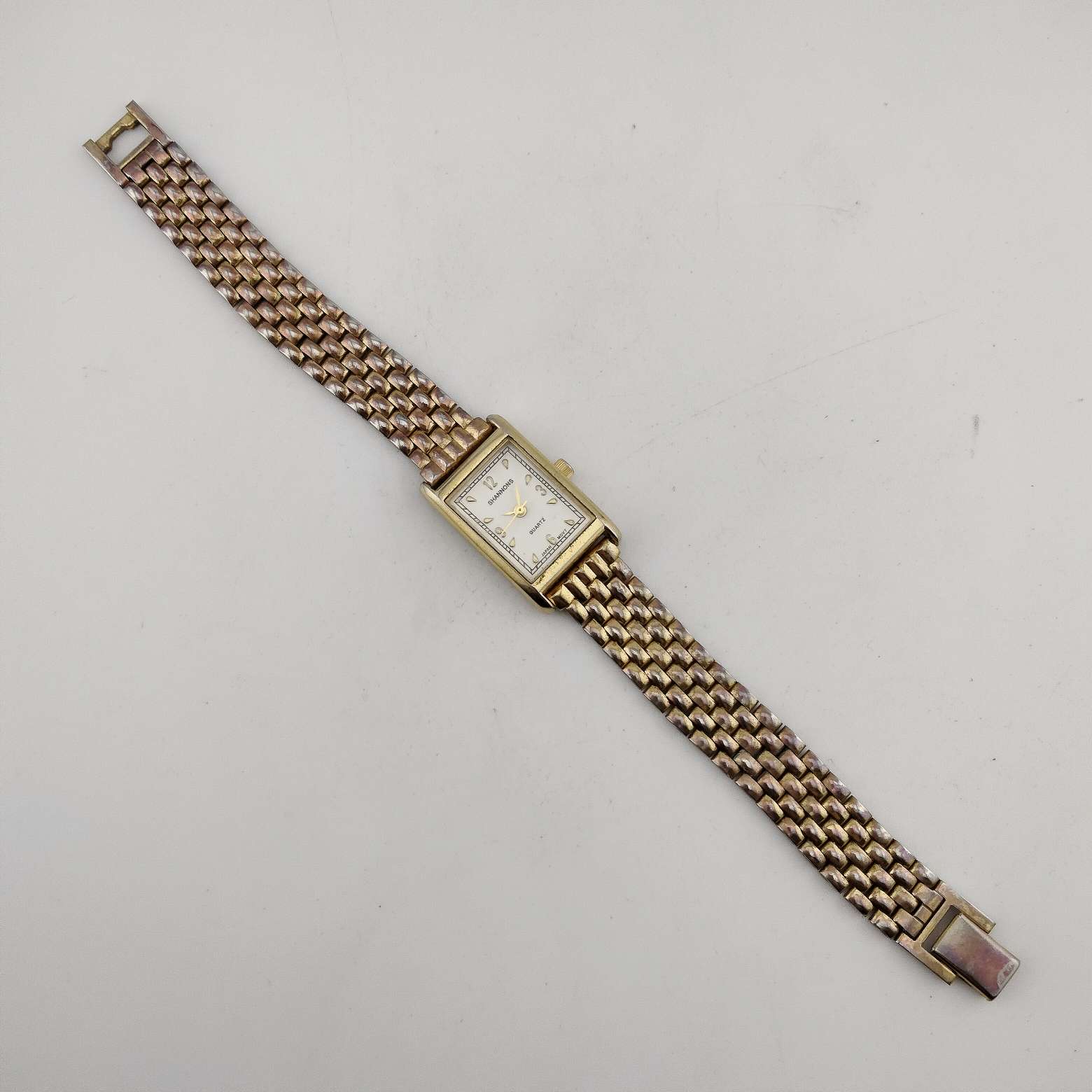 - White rectangular tank style dial with gold tone numerical and tear shaped hour markers and hands