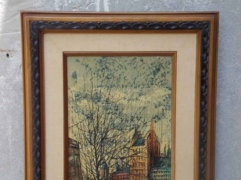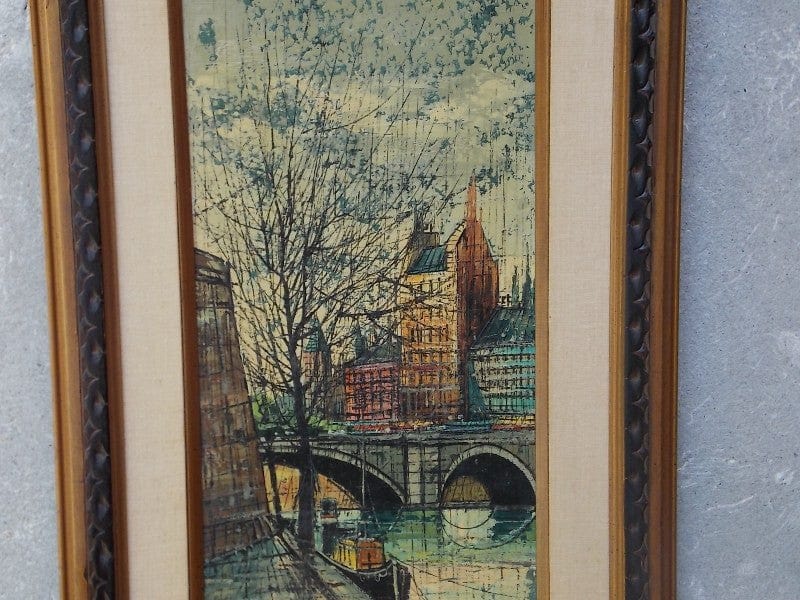 Very Bernard Buffett-ish oil on canvas depiction of a European waterway. So much like BB's works that I wonder if he ever worked under a pseudonym...hmm...yeah, let's go with that. Because this painting is that good and it's fun to imagine. And even if not, the craftsmanship exhibited in this piece stands up on its own. Sister painting in first pic is by B. Nardini and is available either together or separately. Frames are identical and as you can see the styles are strikingly similar and as such these two paintings complement one another quite well.