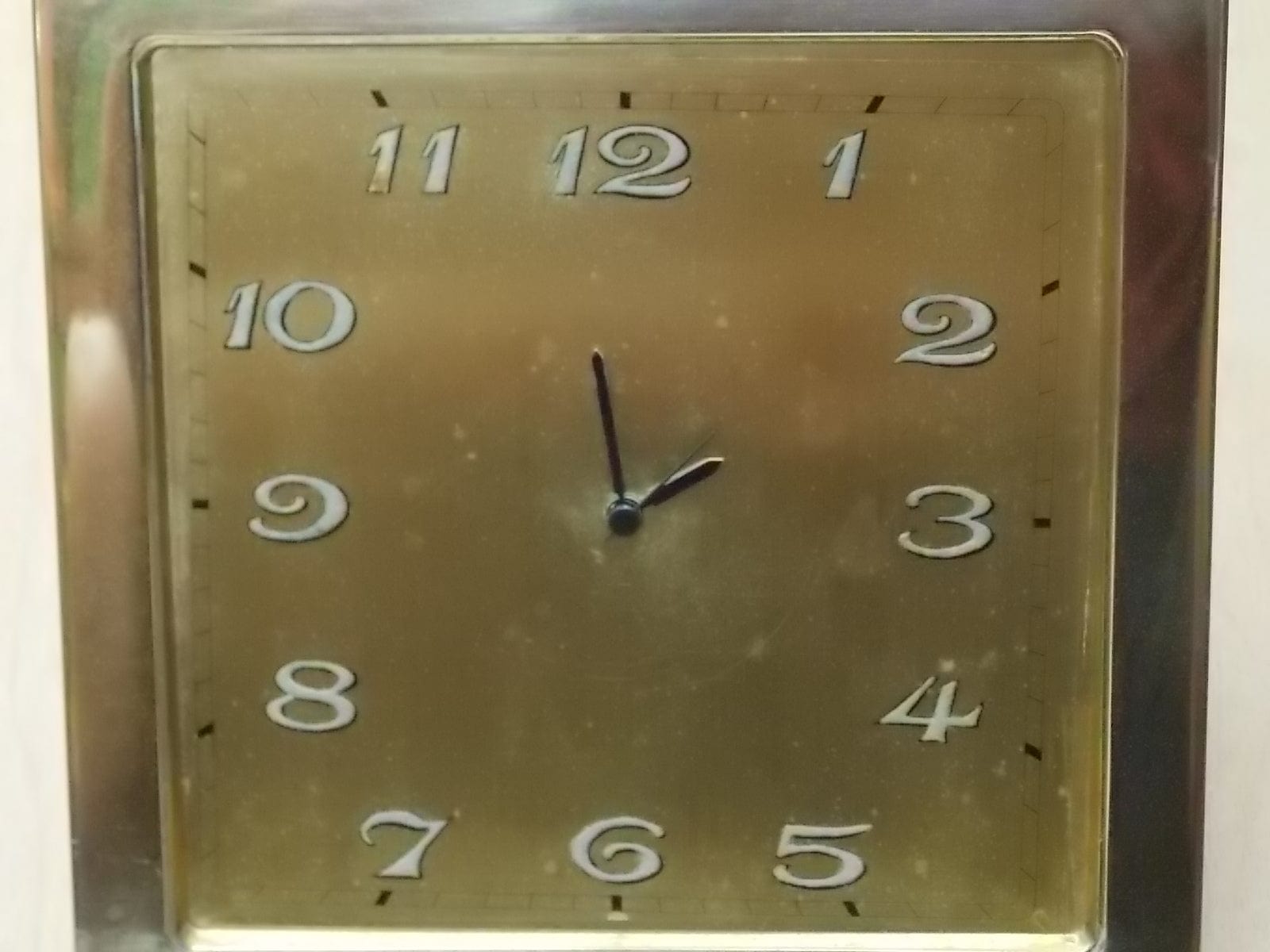 This square golden desk clock is quite old and special, made around 100 years ago by the legendary watch making company Juvenia. Unfortunately, the movement no longer worked, but the aesthetic was certainly worth saving—so we replaced the original wind-up movement with a new quartz one. Now it no longer needs to be wound, just remove the back cover to set it. There are some minor signs of age on the face, nothing that detracts from the overall beauty of this “table clock”, as they were known. Made of metal.