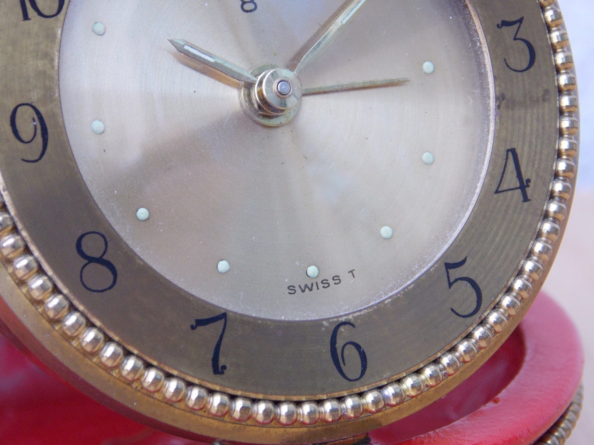 Another Swiza charmer. If the great color of this little red Swiss beauty doesn't seal the deal, the row of brass beading framing the case and the face certainly does. 8-day wind up, alarm, luminescent number markers, fold up case, excellent quality, vintage condition is very good.