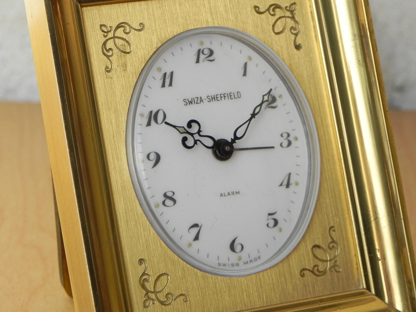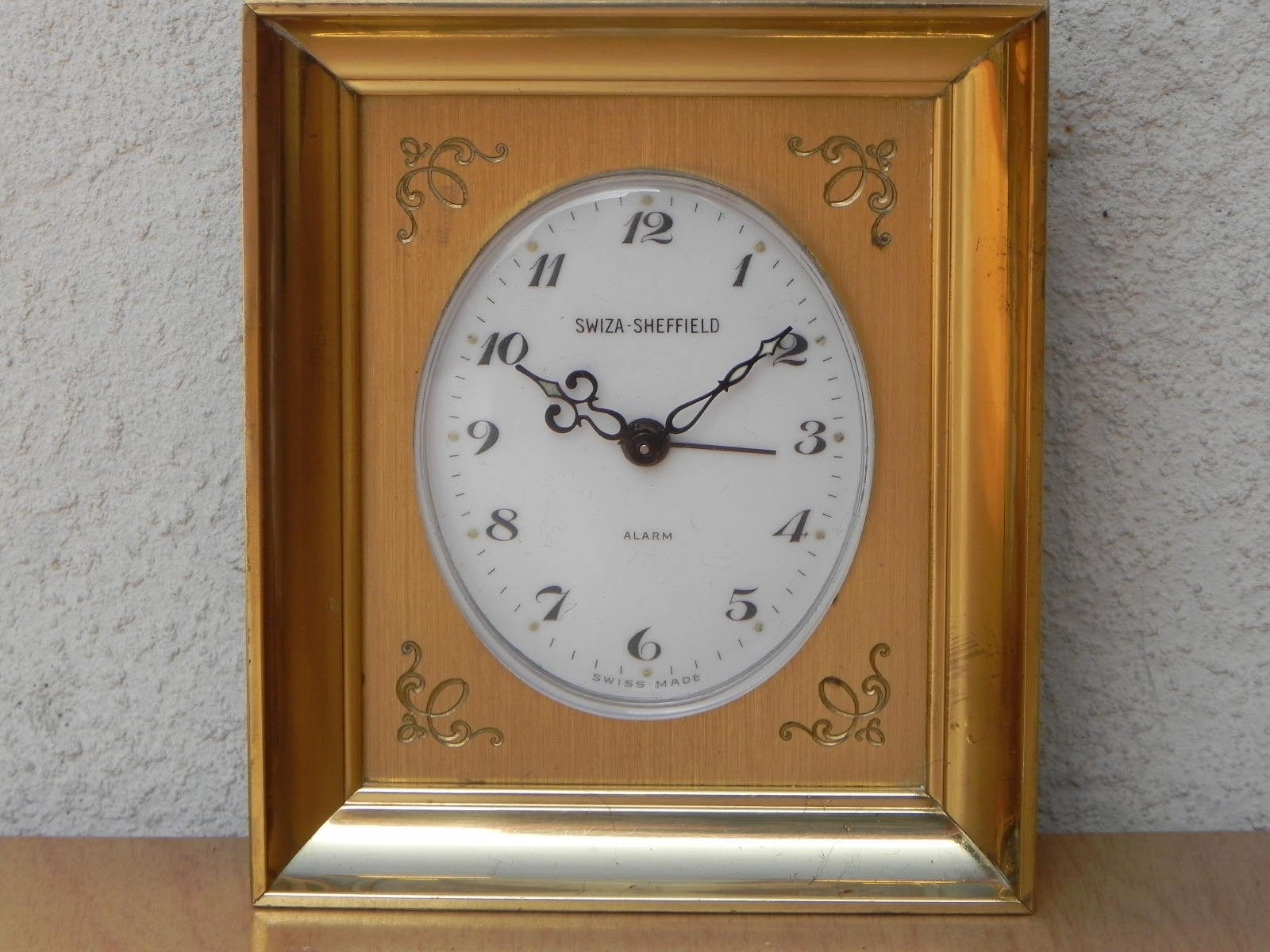 Swiss made and classically charming, this little wind-up mid-century alarm clock sits happily at your bedside or tucks away in a drawer (or suitcase) when not needed. Minimal wear overall. Made of brass with resin crystal. Keeps good time; alarm works.