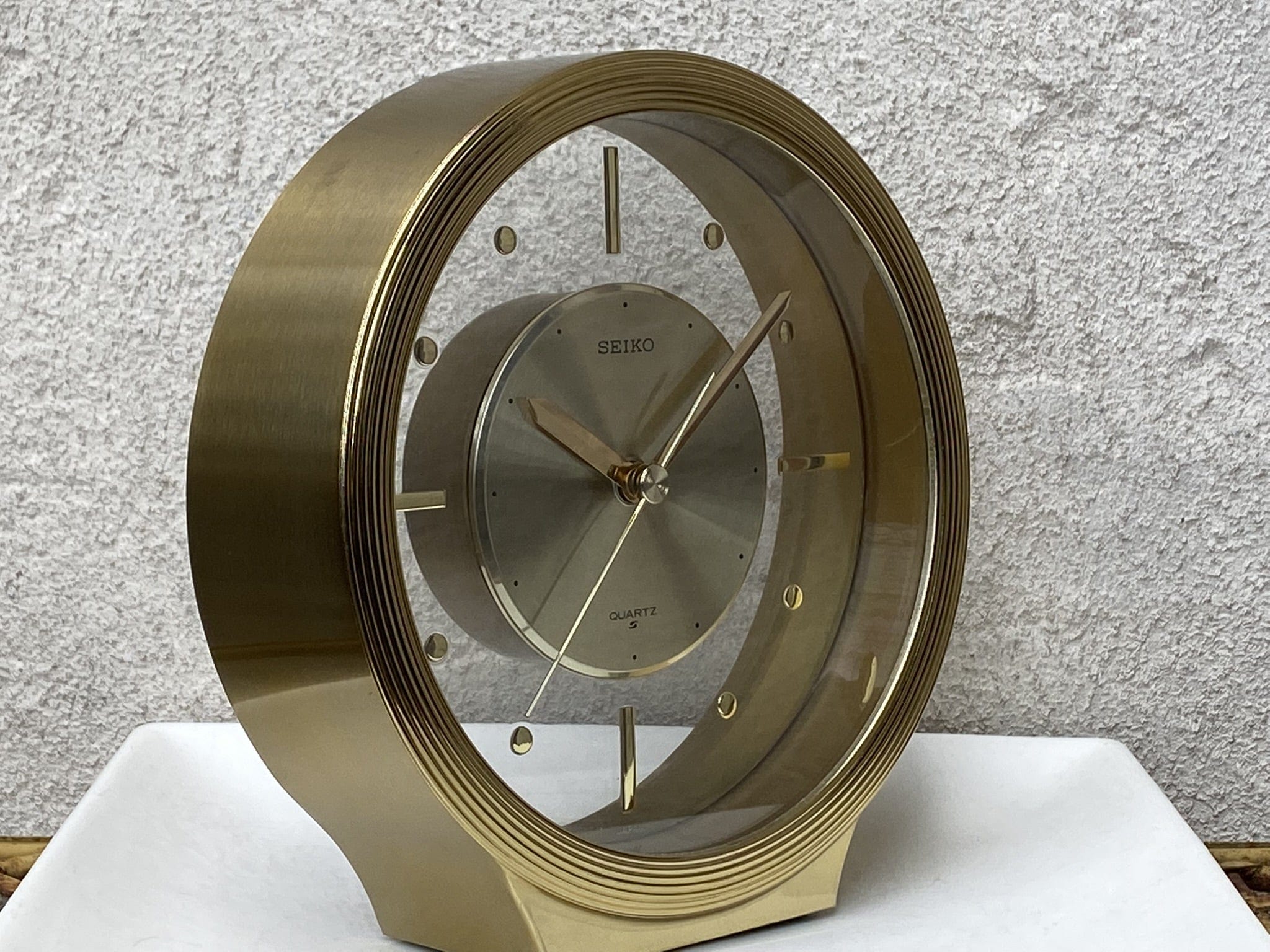 Oh, my, what a handsome desk (or mantle) clock this is, and the fact that it is a Seiko is icing on the cake. Brass and clear lucite work together beautifully, particularly when used for the floating affect you see here. Quartz movement using a single double A battery. Just a high quality clock in every way!