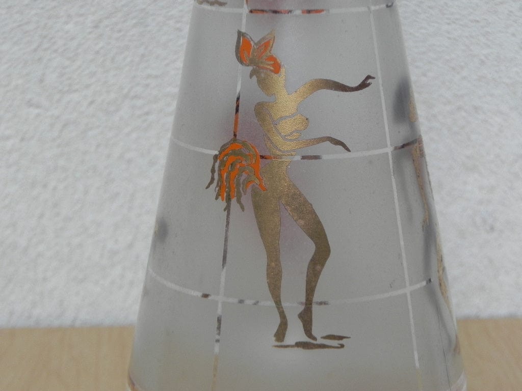 This charmer drips 1950s, though not literally, because it holds water. What liquid did it hold originally? Who knows! The graphics are all in good shape, with little loss of the gold or the orange. Lid fits well, clean inside.