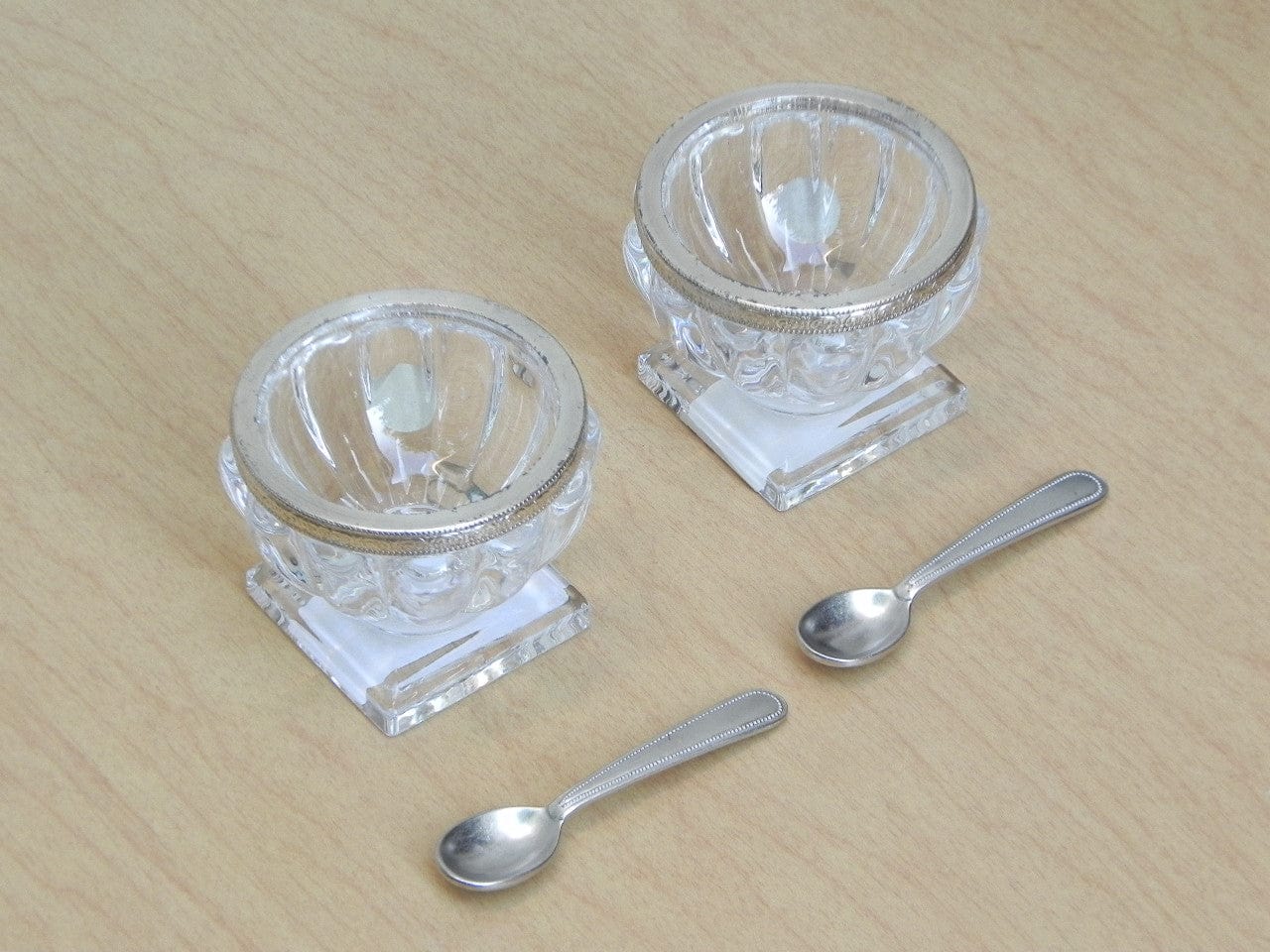 This elegant pair of salt bowls hail from the famed Texas-based high-end retailer Neiman Marcus, and will complete your table setting. They are made of gorgeous leaded crystal with silver rims, made in Italy. There is a small amount of pitting on one of the rims, but please note that the photo makes it look much worse than it actually does in person (it is barely noticeable). They are in their original box for storage (or gifting). A lovely set, spoons included.