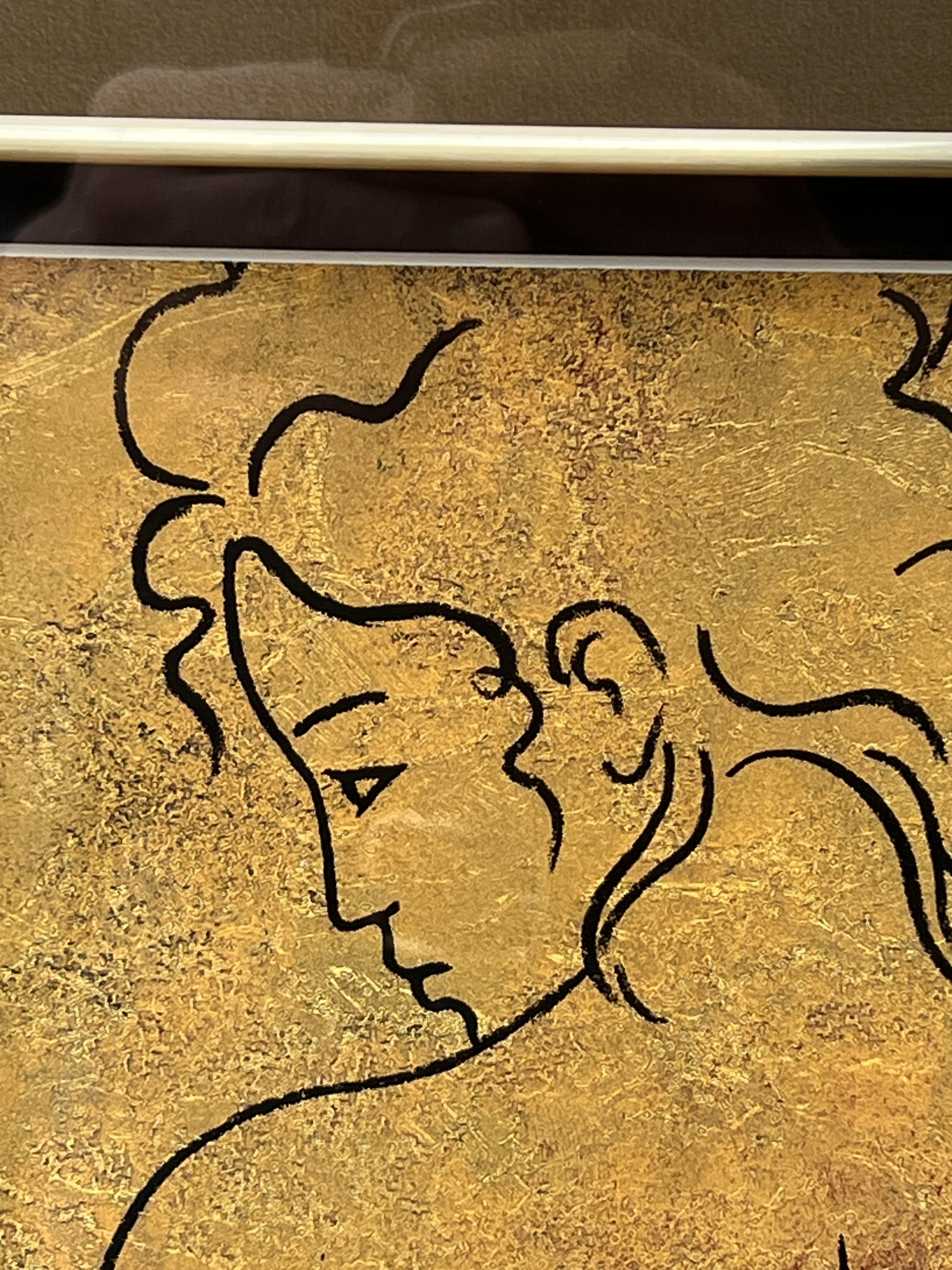 The lines of this female nude drawing are pleasingly minimalist, but everything else about it is maximalist. Rich gold tones, solid wood frame, high quality glass...it all adds up to the weight of quality and the kind of art adults have in their homes. Made by Gerard Art in 2005, which to some seems not so long ago, but those people are in denial and even they know it. A lovely piece of framed wall art.