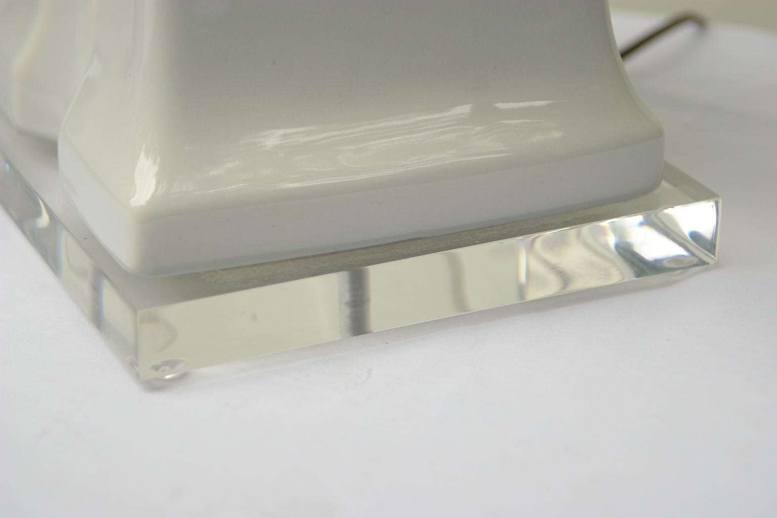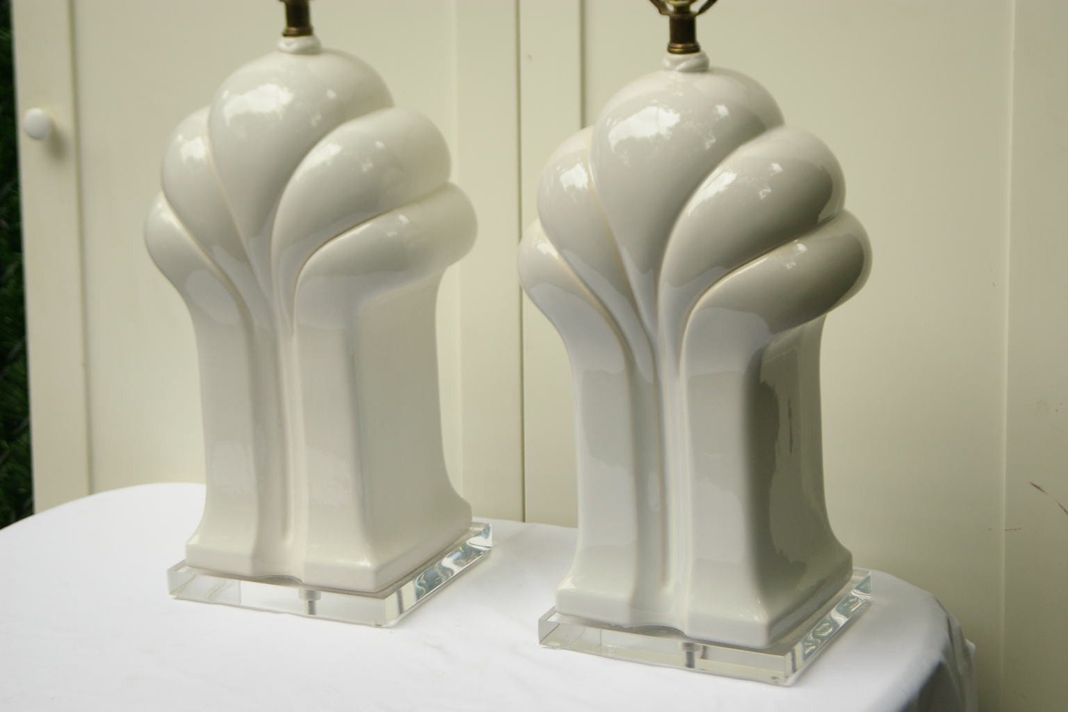 Big, white and gleaming, these Hollywood Regency Deco-y table lamps are shiny sculpted ceramic with Lucite bases.. They could be the perfect lighting accents for a glamorous white themed room, ala Hollywood circa 1930.