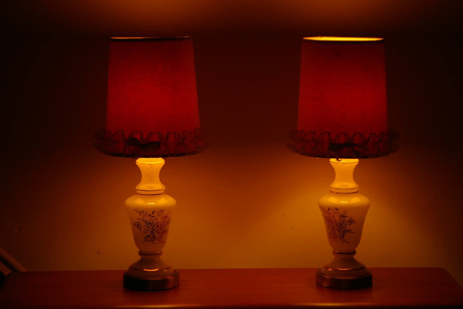 This is a sweet and frilly pair of white and gold boudoir side lamps with original ruffled shades. The white glass has depth and sheen. The gold painted detailing is in excellent condition. Sticker reads "Base made in France" and the glass is very similar to Murano glass, although I cannot substantiate that. The shades, with bits of gold thread in the ruffles, are in very good condition as well.
