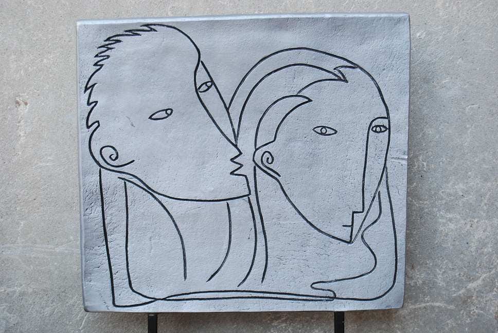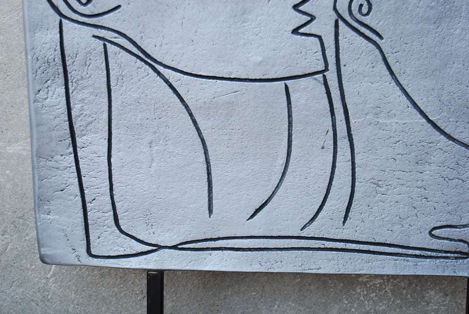 This unique piece of decorative art is quite substantial and very modern. The heavy ceramic top appears to float, improbably, on its metal base (from which it comes off easily, for storage or shipping). The textured grey, almost metallic background sets off the expressive line drawings of a man and a woman, who seem to know they can be seen yet are also enjoying a private intimate moment between themselves. What an artist can convey in several simple lines is impressive. Though not a mid-century piece, it is about 15-20 years old, and is in very good condition. We have no information about the artist or maker but we know it is a quality piece made with durable materials.