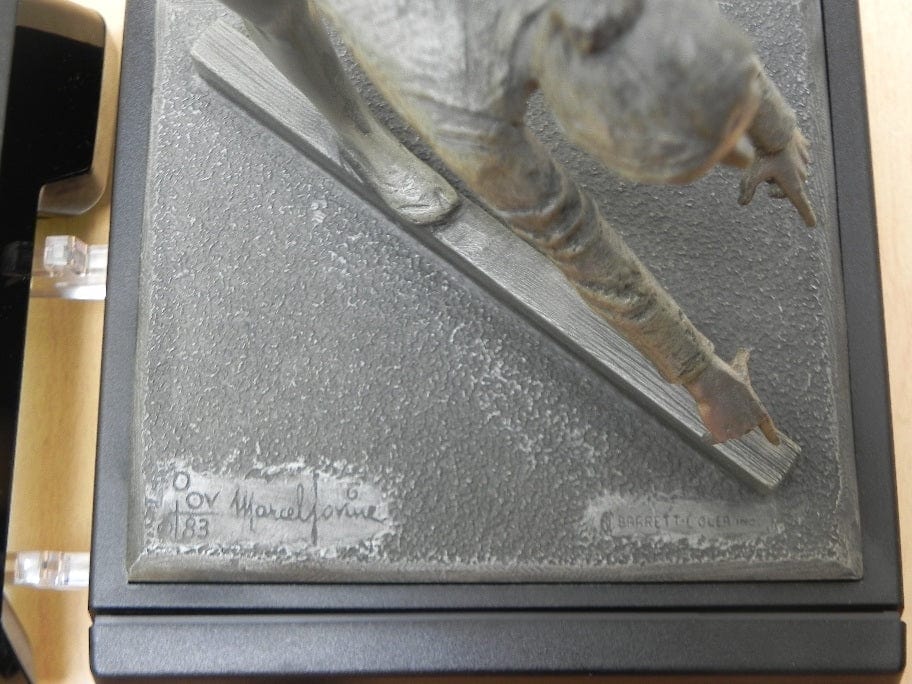 This AT&T telephone was made as a tie-in to those games, a series of phones featuring pewter sculptures by sculpture Marcel Jovine. Happily, we have the best of that remarkable series here: the elegant gymnast, with leg extended high. Had it been made after the games, it might have resembled Mary Lou a bit more...but no matter, she is lovely. The telephone works well, with a pull down front to reveal push buttons. This is a rare and unique desk telephone, the perfect gift for any Olympic fan.