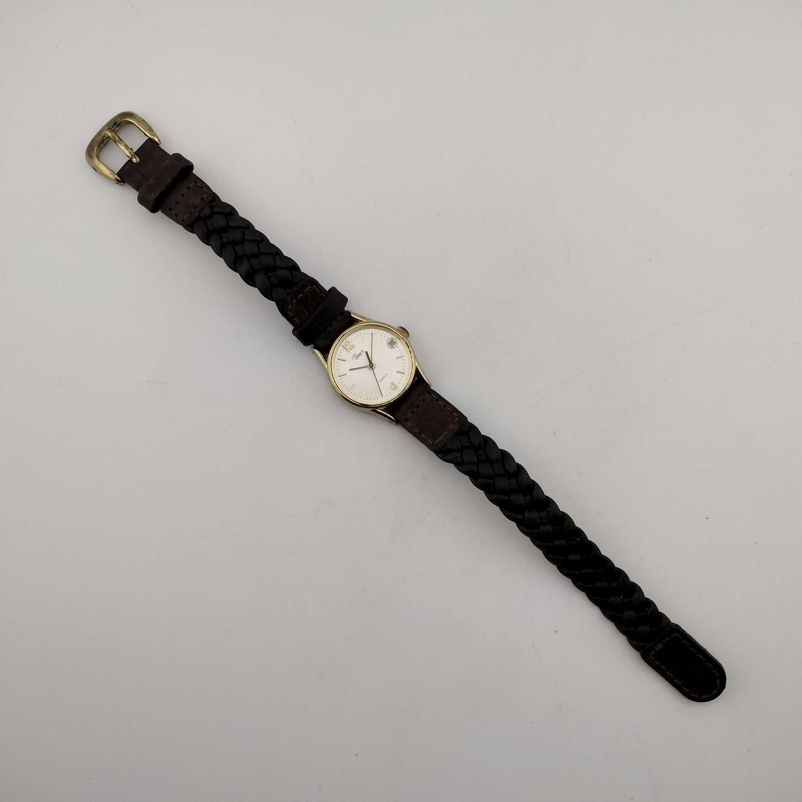 - Adjustable braided brown leather strap, up to 6.5" long