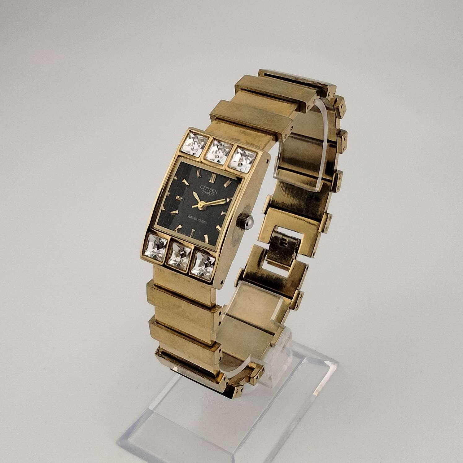 - Black rectangle dial with raised gold tone dash hour markers and hands