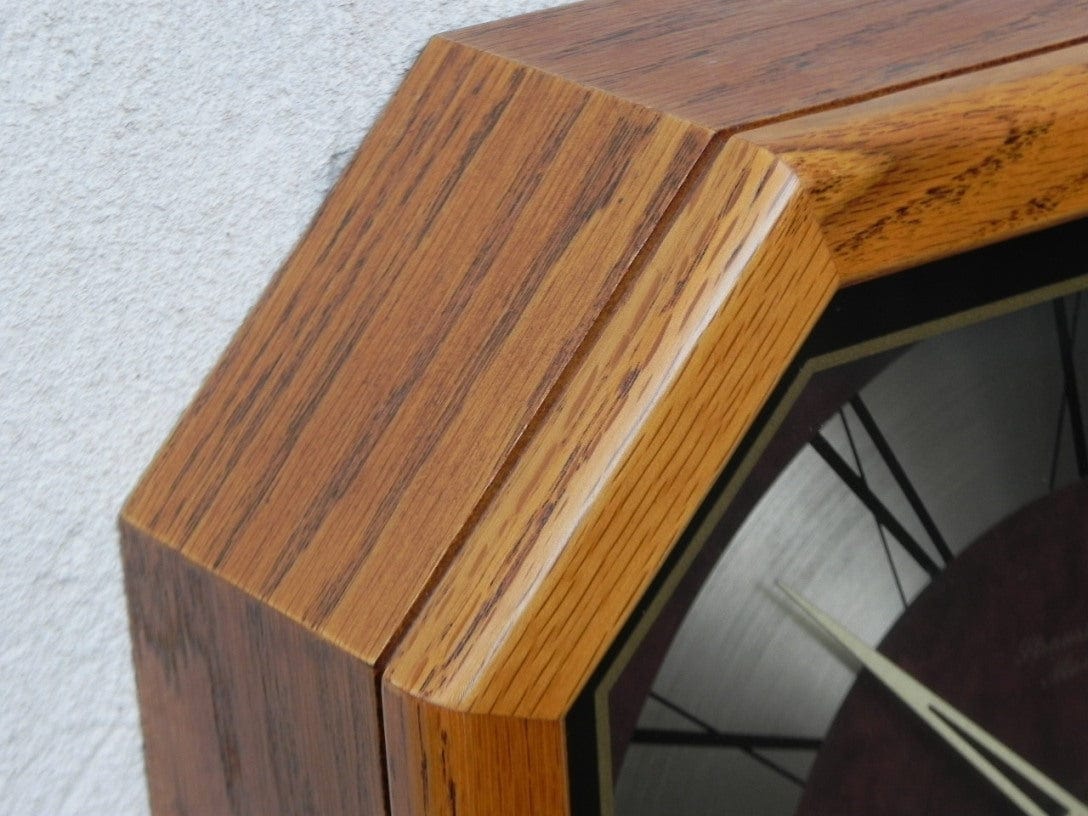 This Strausbourg Manor clock has both a traditional and a modern look—it exists stylishly at the crossroads of the two. The solid oak case gives it away as a 1980s piece, but the truth is that oak is a worthy wood in any decade. Though not the most common octagon, it is in fact 8-sided, and it is a very well made octagon at that. The burgundy brown face with the silver circle is a great look, and those hands are just downright fabulous. A battery quartz Japanese movement makes this an easy wall clock to own; the battery also powers the swinging pendulum, a mesmerizing feature that will make your home look like a grown-up lives there.