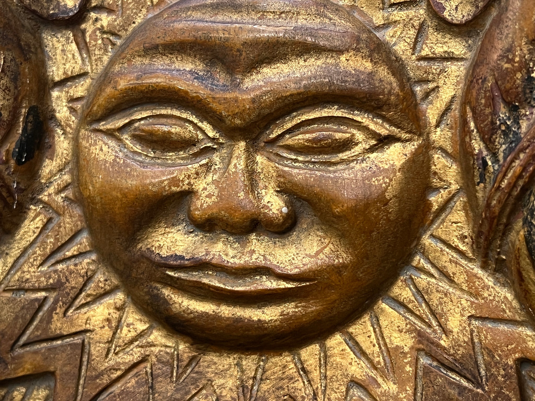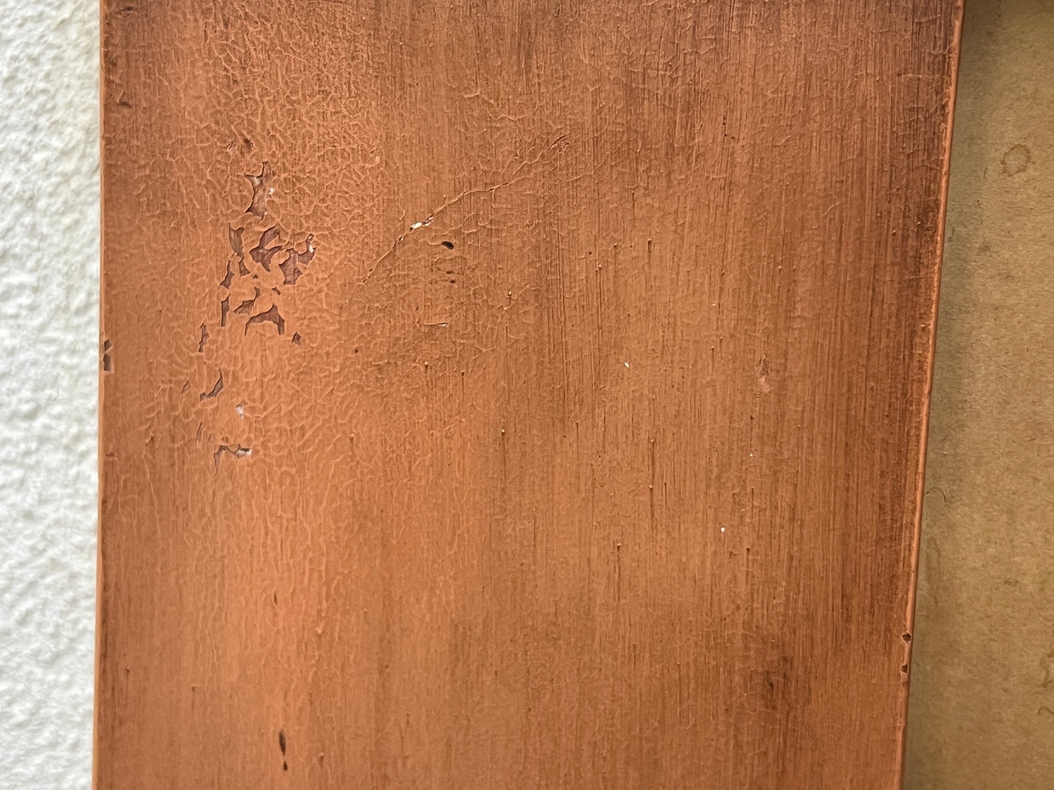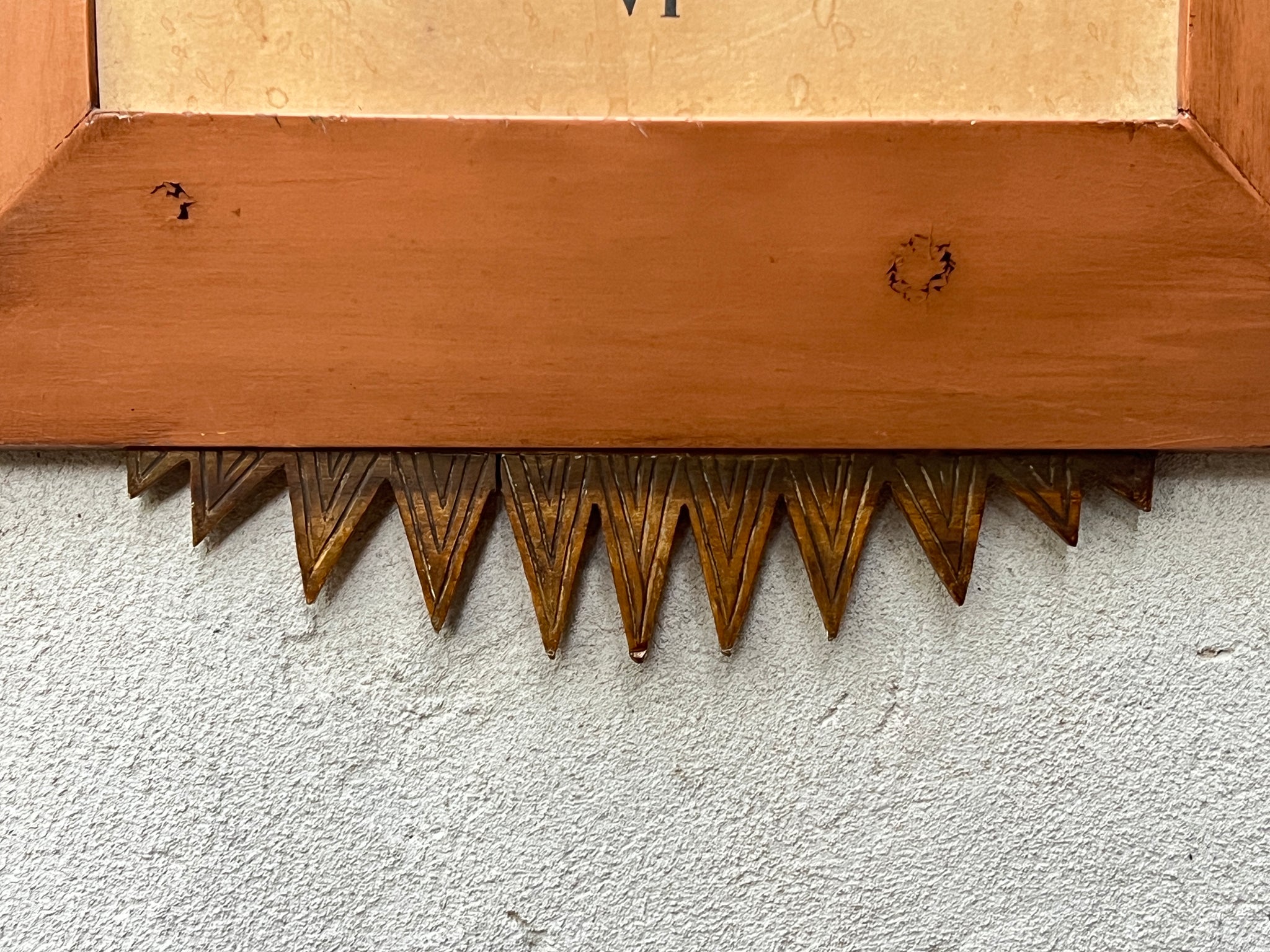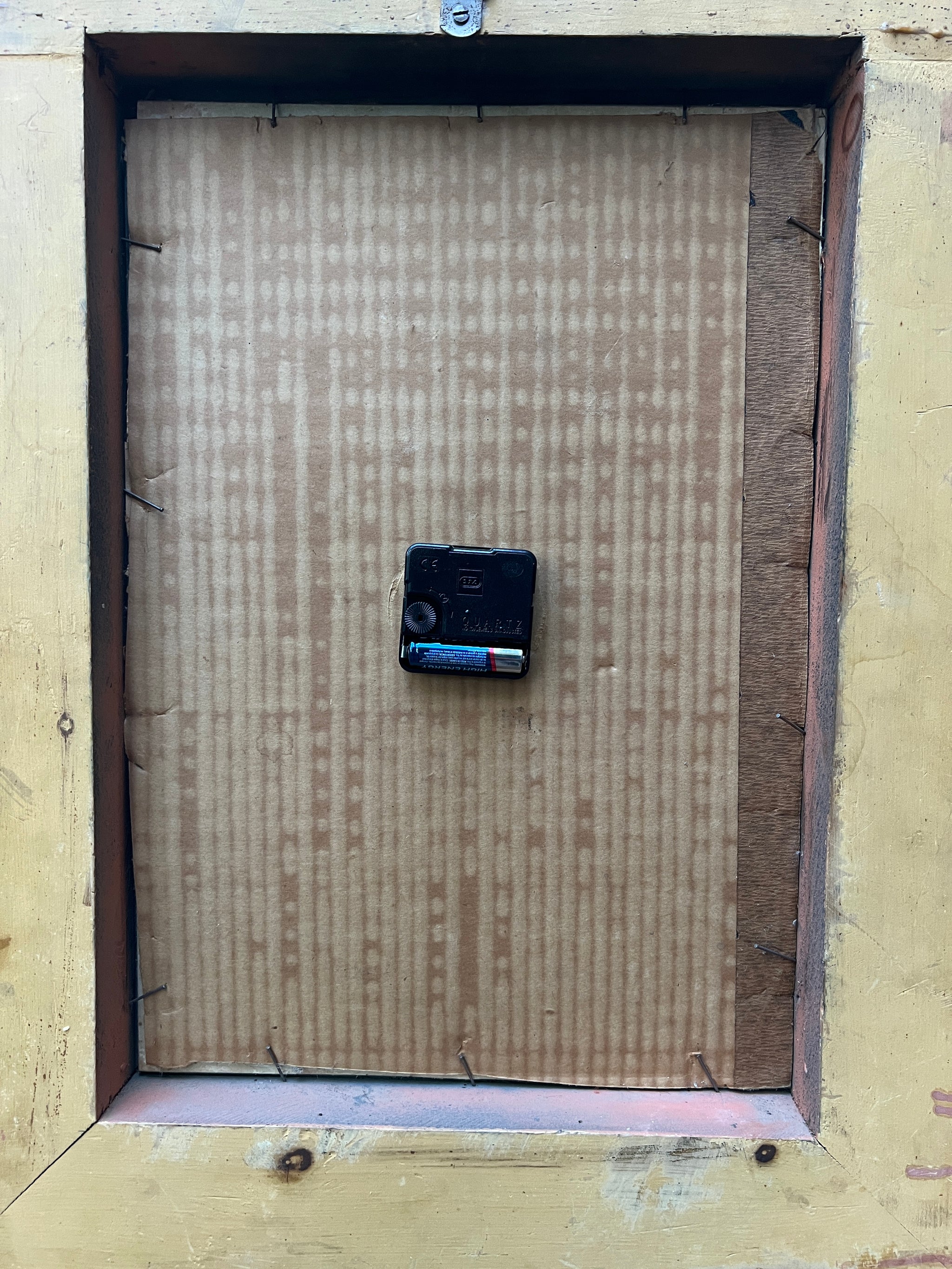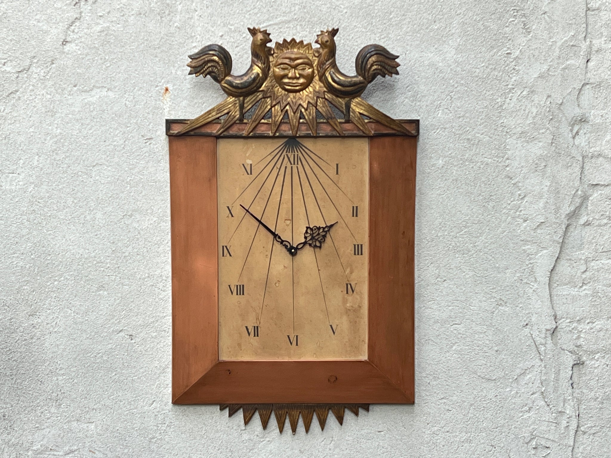 Hand carved in Italy, this wall clock is old and interesting and specific...totally perfect for the right home. With a golden sun and two chickens, it feels like its from the a certain time and place in the Italian countryside. It shows some age, but honestly, that's just part of the immense charm of this aesthetic. Large, wooden, hand carved, updated with a battery-powered movement.