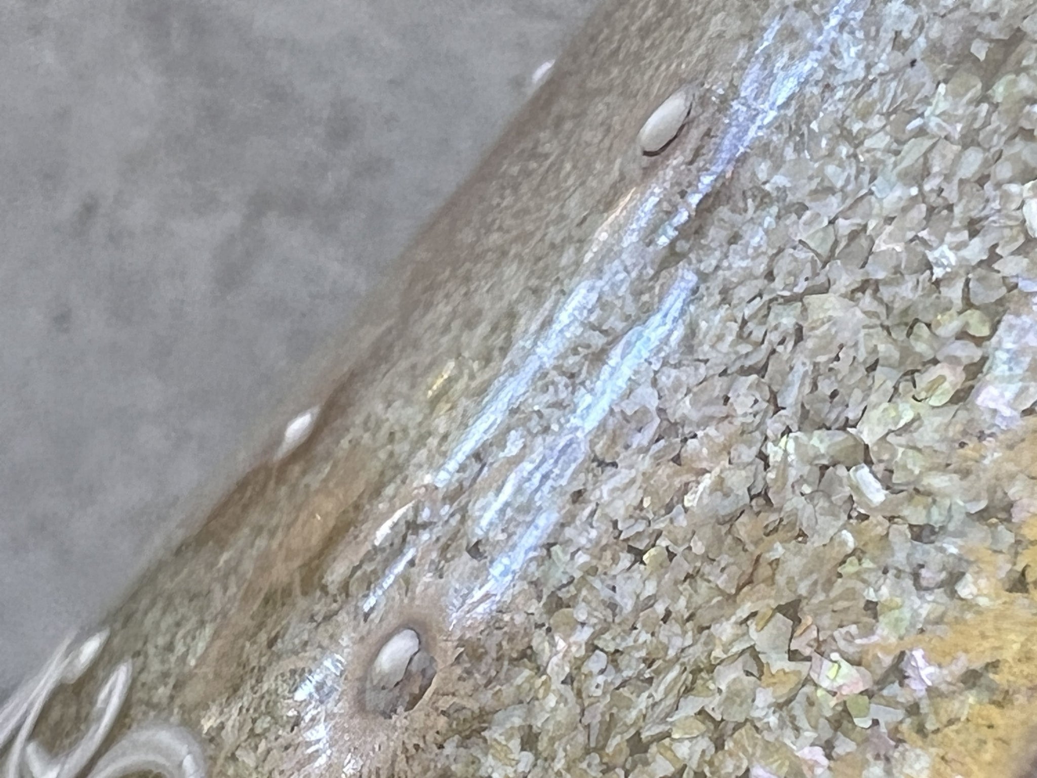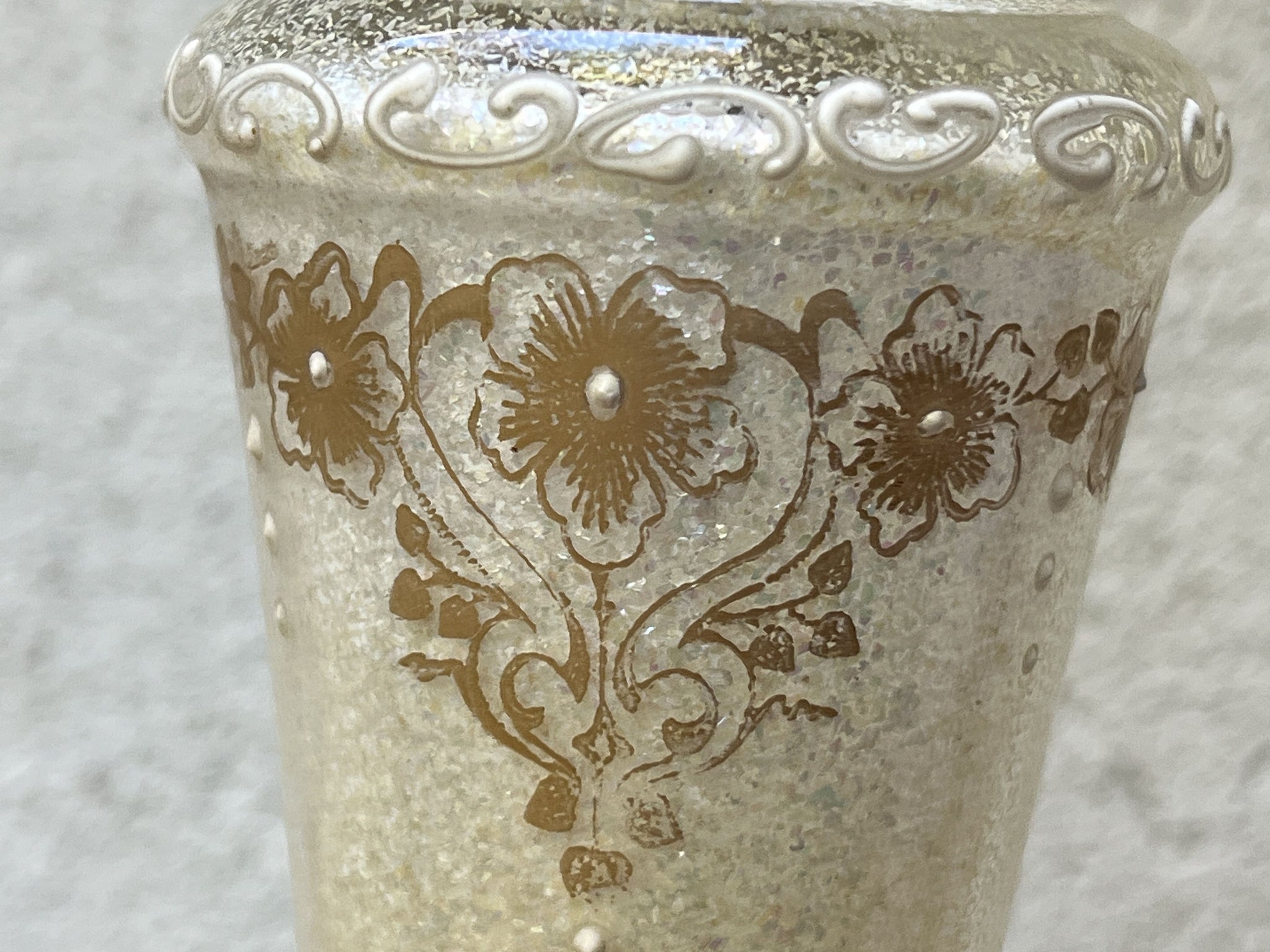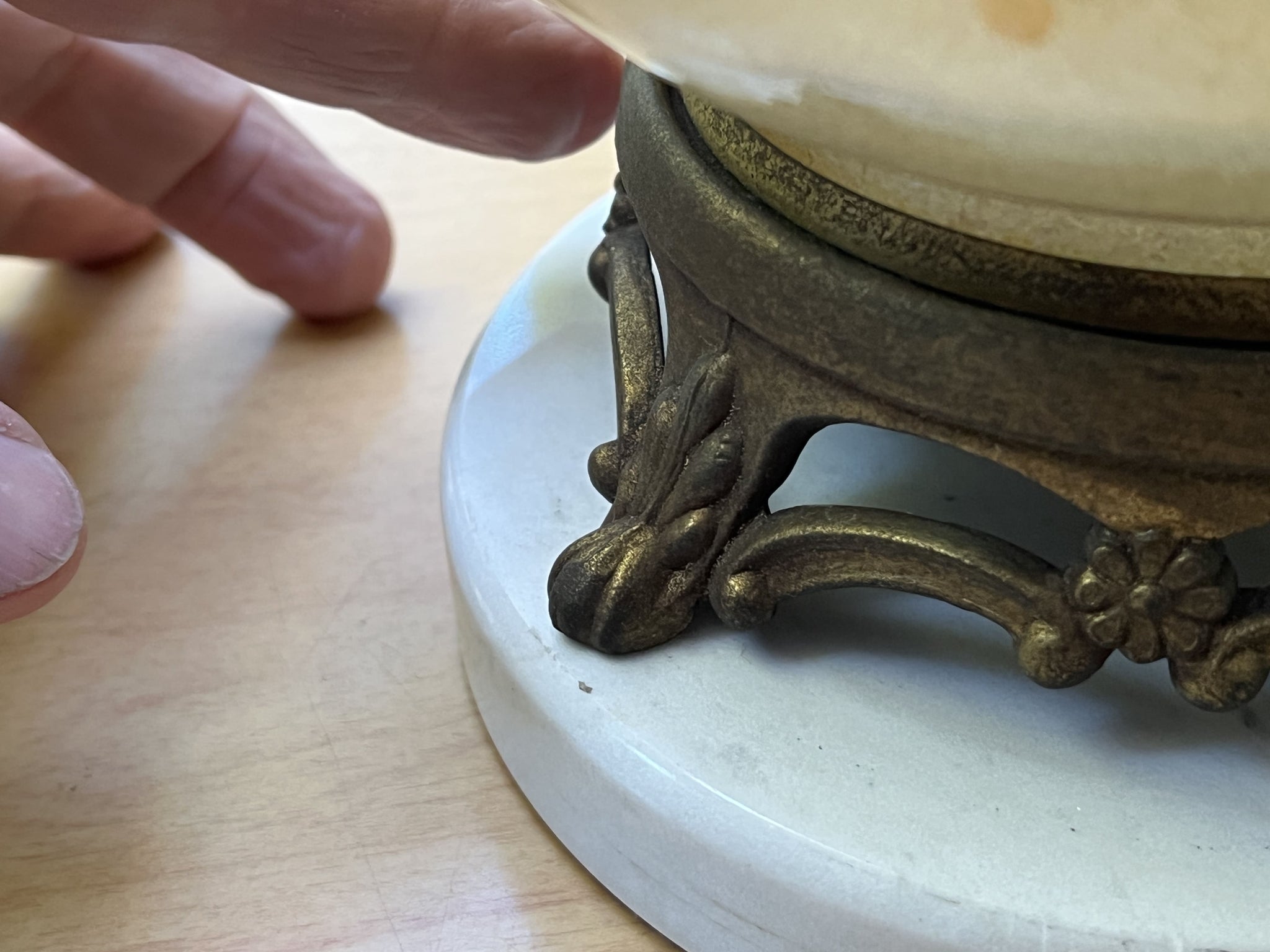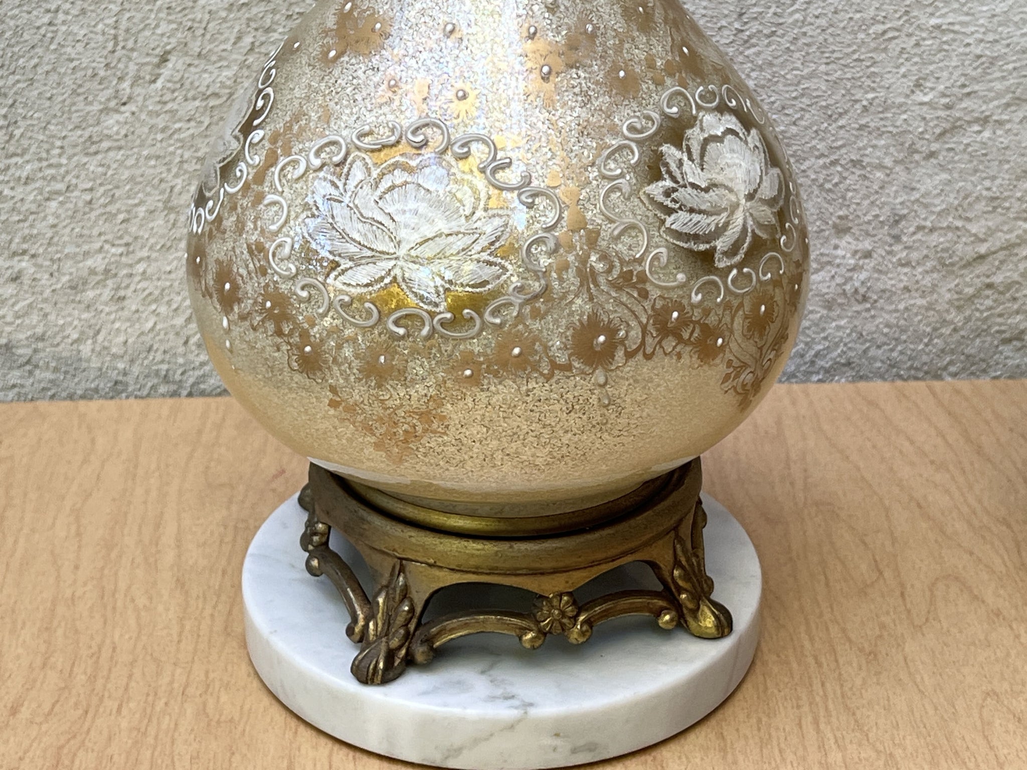 This is a pair of glass, mint-condition vintage tear drop shape table lamps are from a time when more was more, and if more looks like this, why not? White and gold, a gorgeous combo. Venetian style glass is hand painted and decorated with gold and white designs, raised on the glass in case there is any doubt it was done by hand (there is not). Solid brass and solid marble bases further indicate this is a high-quality pair of lamps. Find the perfect shades for your space, and let these lamps do all the work of making your space unique and impressive.