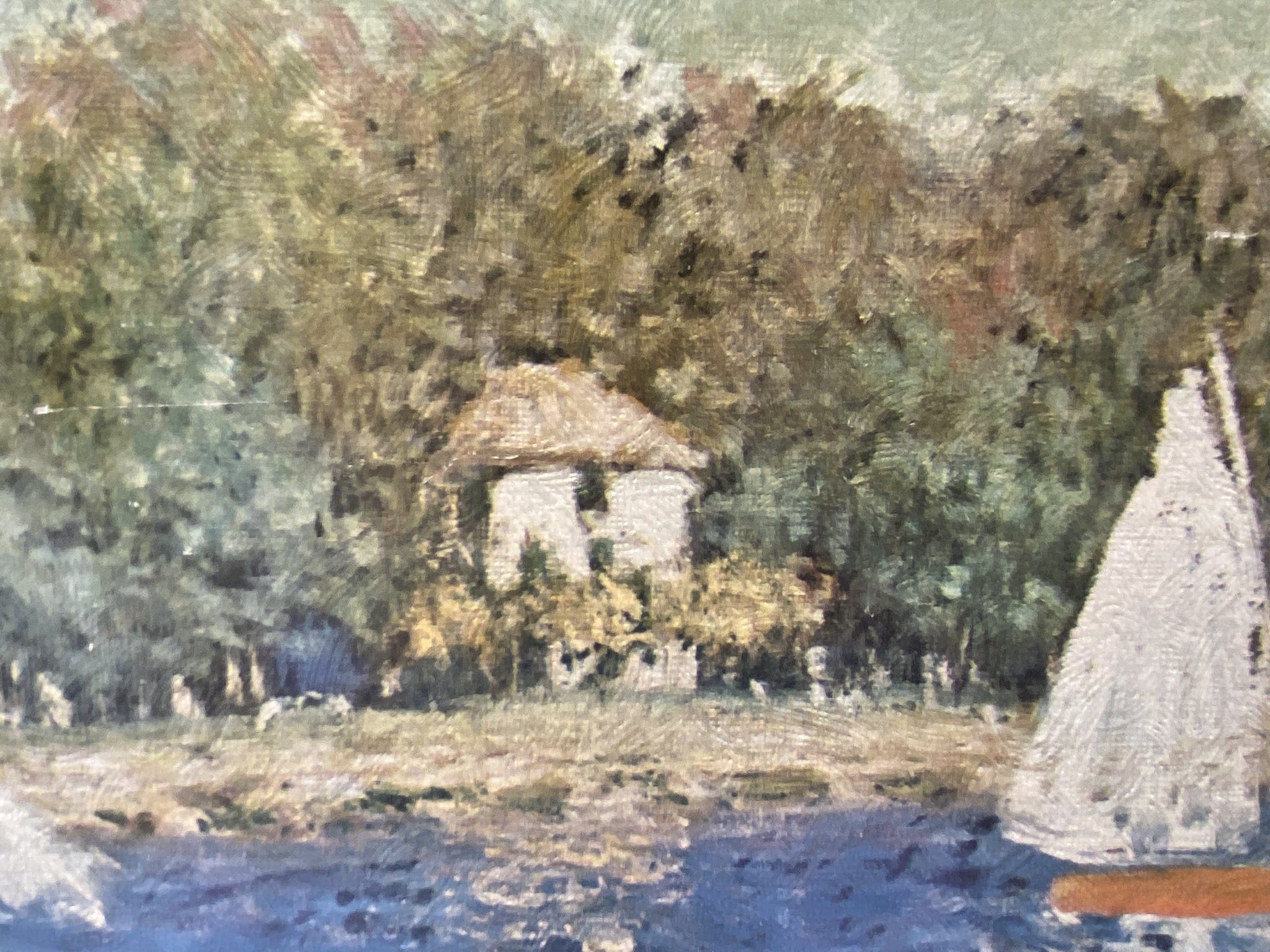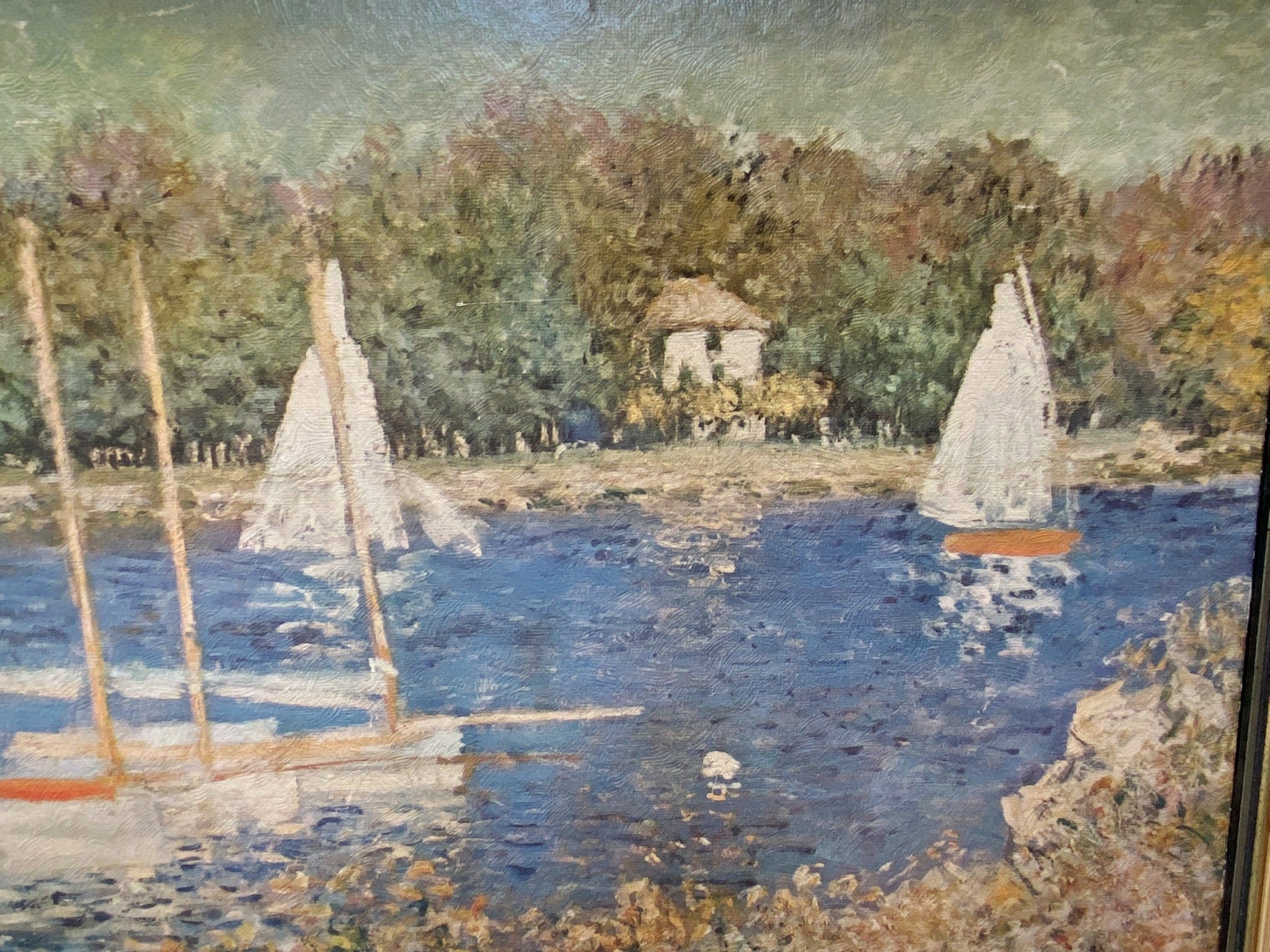 Oh to inhabit the world of Claude Monet, full of dreamy scenes like this one. Actually, thanks to his artistic abilities, we sort of can, any time we gaze upon one of his works. This is a print on textured board, a favorite of the mid-century era, for good reason, it lends an authenticity to the feeling of seeing a painting. The frame is solid wood. Charming!