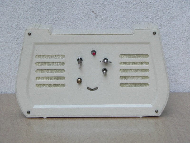 This attractive white clock is in like-new condition, with very few signs of age--except, of course, the fact that it is a wind-up clock "professionally assembled in Japan". It is an alarm clock that is stately enough to sit on your mantel, which is a bit unusual. Hard molded plastic with brass details. Works well, has quiet tick.
