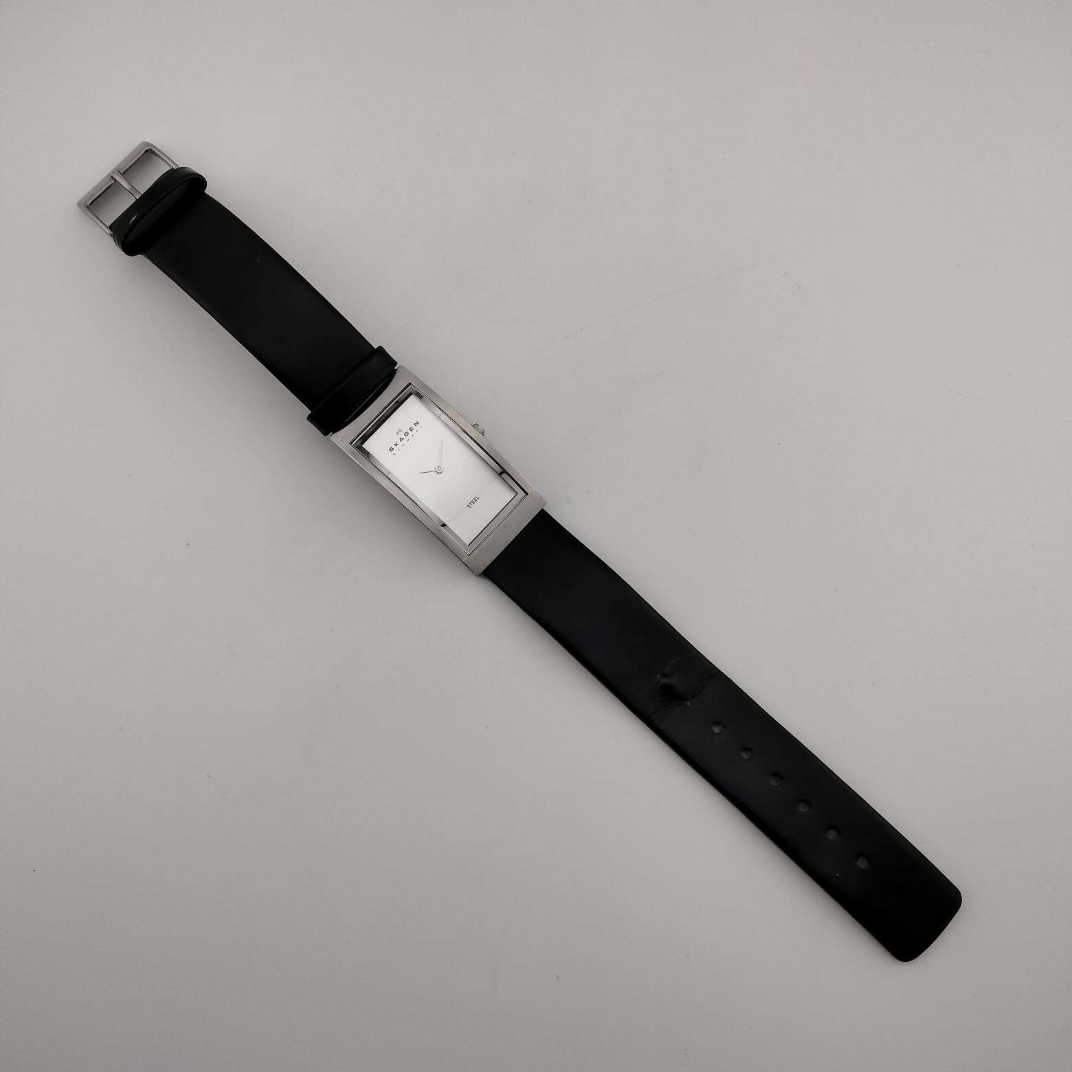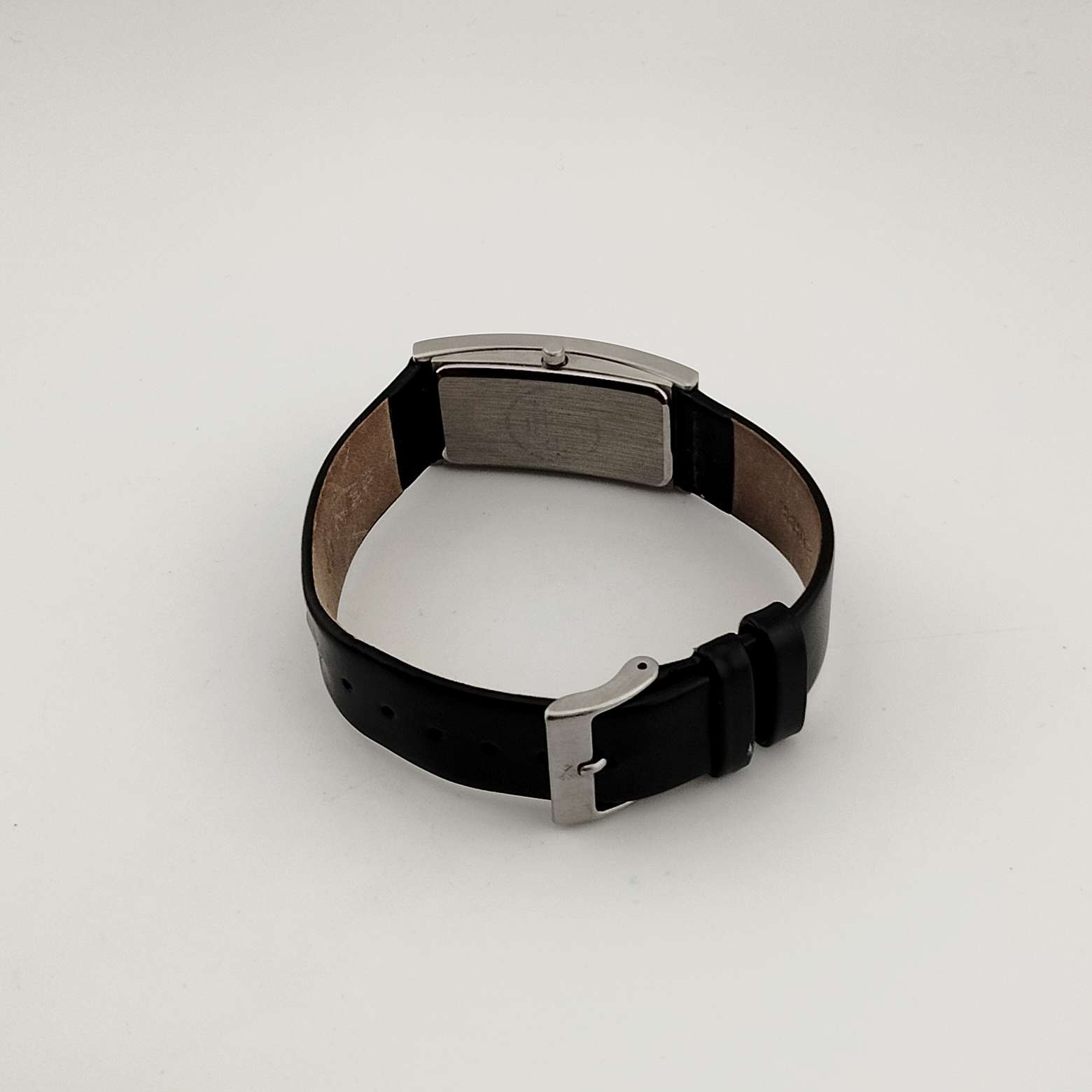 - Rectangular silver tone minimal dial and hands, no hour markers,