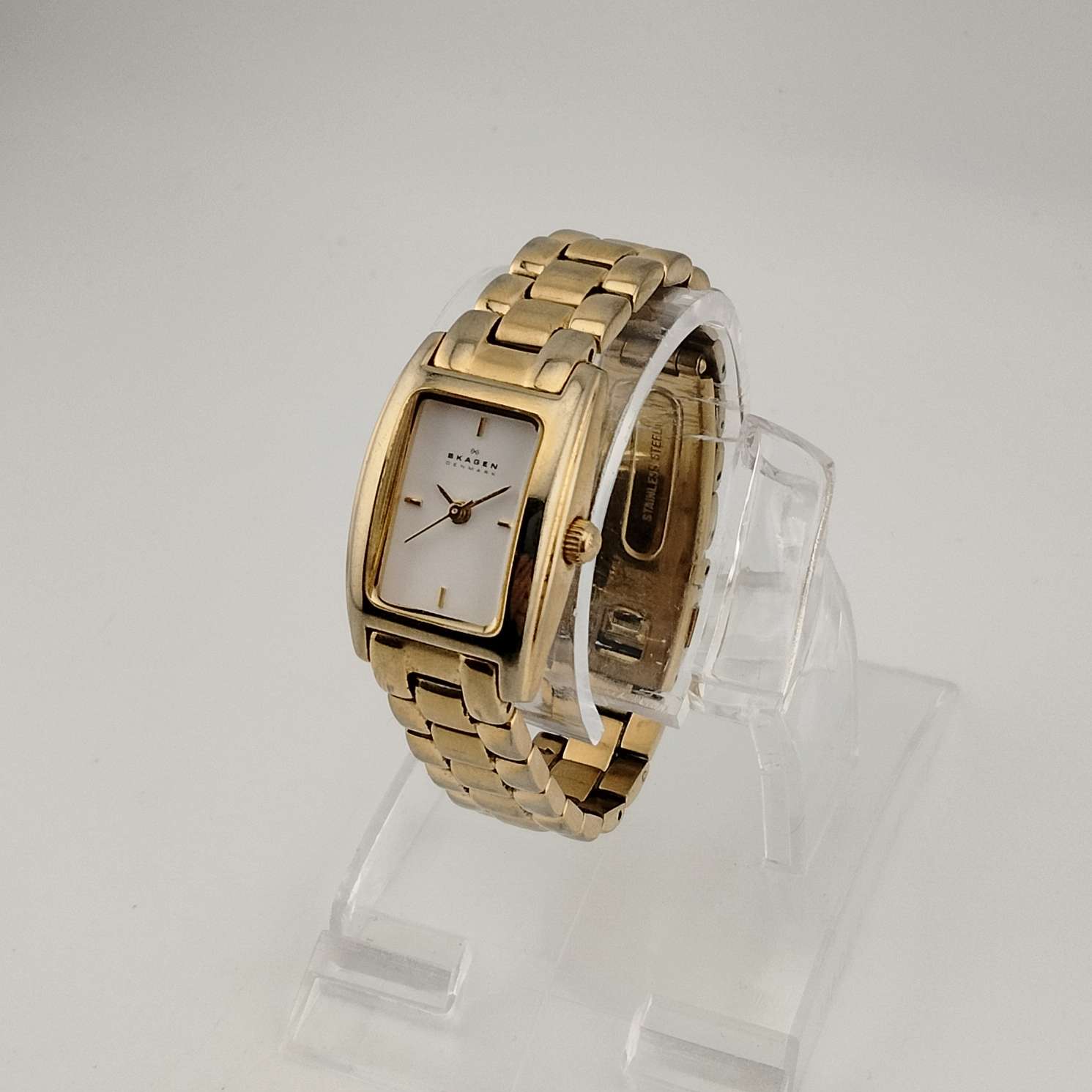 - White rectangular gold tone dial, 4 raised gold tone dash hour markers and hands