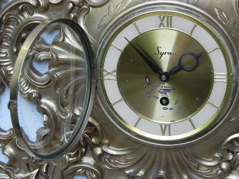 Wonderfully ornate resin wall clock from the fun people at Syroco. This really cuts a nice line and it's in nearly mint condition, save for a few tarnish marks on the brass face. That's how your friends will know you didn't get it at Target or on Amazon and as such, there aren't two hundred million others exactly like it, with another two hundred million on their way on the slowest and largest boat ever coming from China. Has an audible tick tock but it's a clock, people. 8-day wind-up movement was a real breakthrough in the mid century, which meant that they no longer had to remember to wind their clocks once a day. Nope, once a week was plenty and so, with even less discipline required to maintain a life of punctuality and decency, thus began the decline of Western Civilization. Honestly though, 60 or so years into the 'Great Decline' and things really ain't so bad. So just enjoy this clock for what it is, a beautiful piece of kinetic, ticking sculpture for your wall, and from now on, let's agree to keep politics out of clocks.