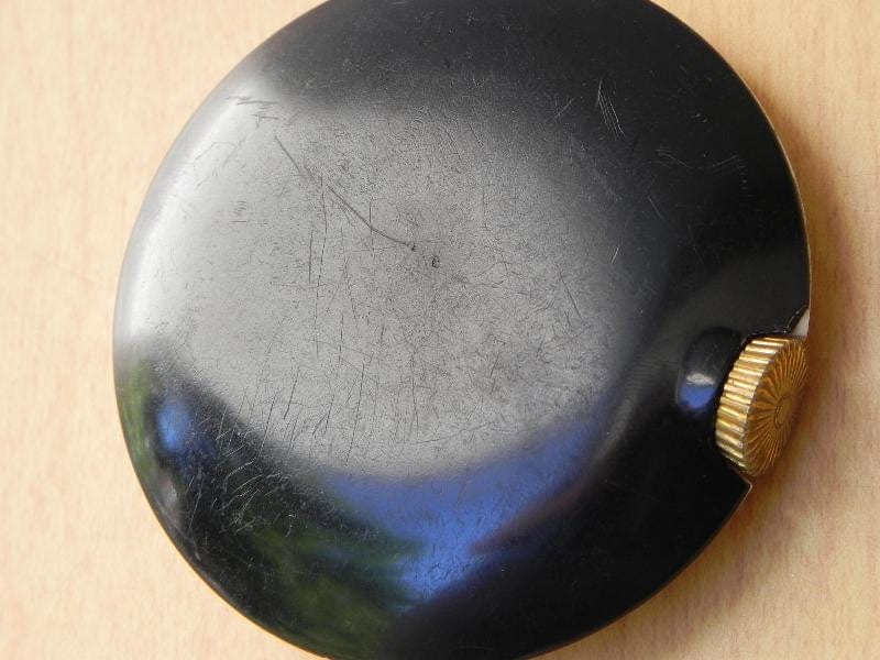This petite vintage Bakelite miniature ladies purse clock feels good in the palm of your hand. Smooth. We have three of this lovely little item for sale, not because they are common (they are not) but because we love them and therefore search them out. There is no stand—rather it lies on your desk or bedside table. Please note that it has no alarm. The dial on top is how you wind it, and there is an adjustment lever to tweak the speed as needed to keep accurate time. Crystal is glass, numbers are in relief in metal, case is bakelite. Some wear here and there, as shown, but very charming.